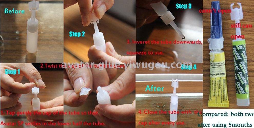 新产品,弹扭即开,重复使用,解决传统铝管和塑料瓶中胶水没有用完就干在瓶中的问题。