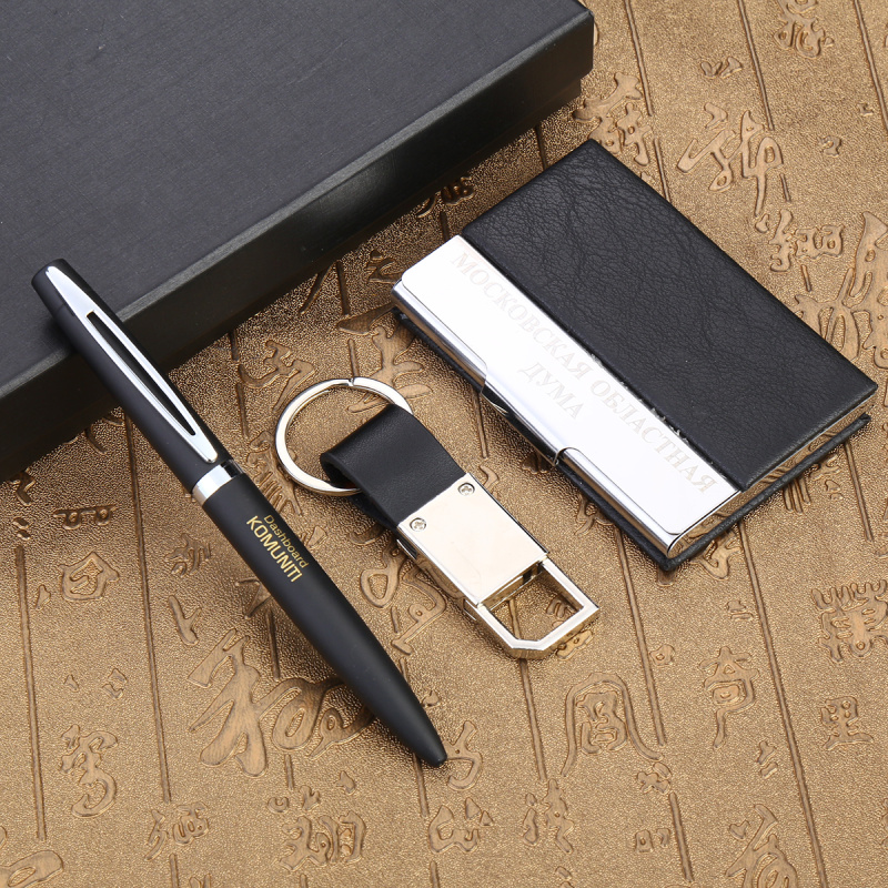 【材 质】 金属圆珠笔为铜材料,名片盒为不锈钢包皮,钥匙扣为锌合金材料配PU皮