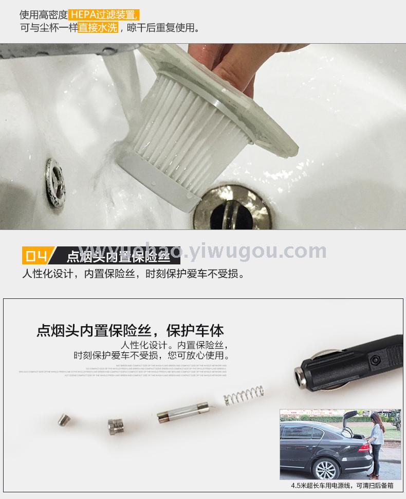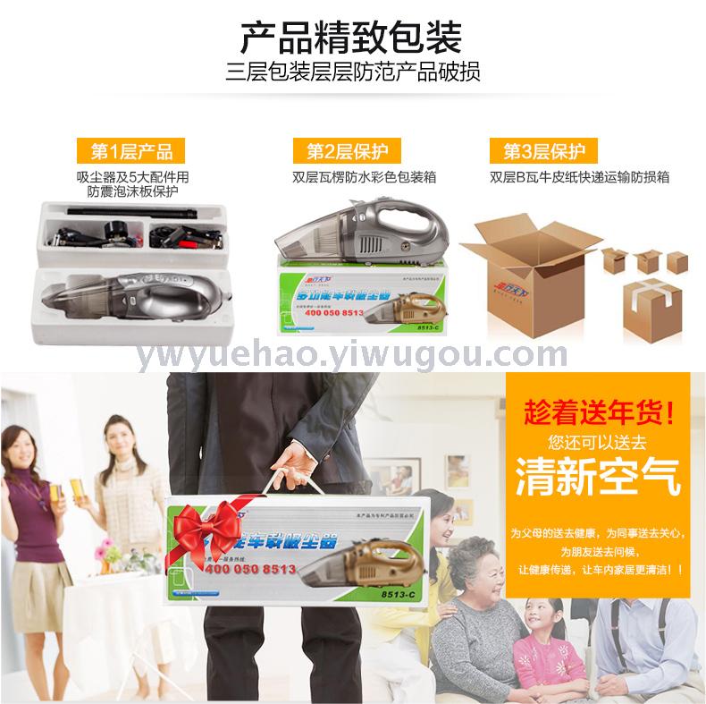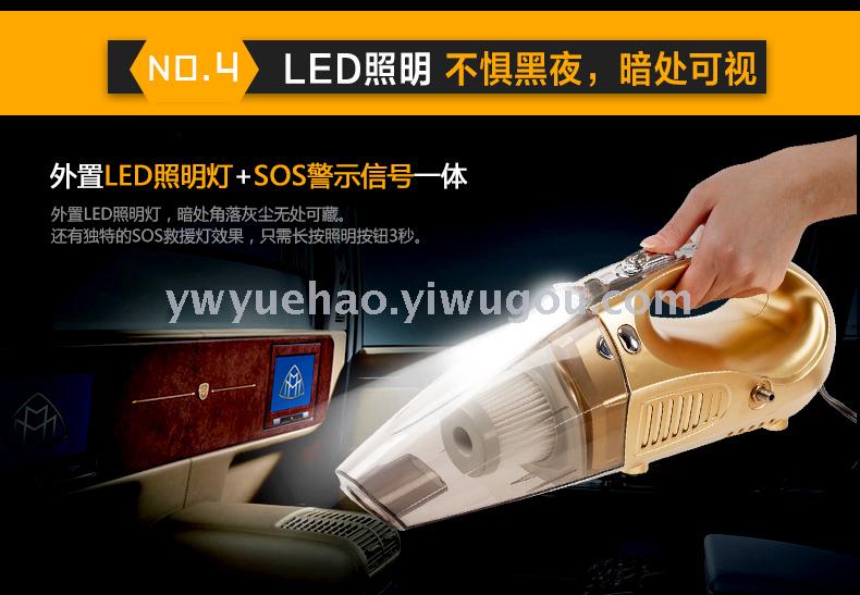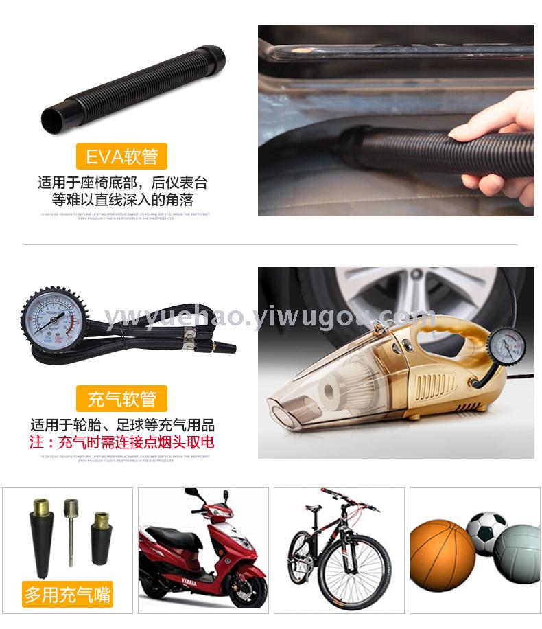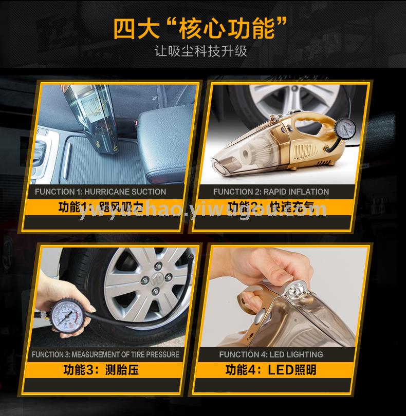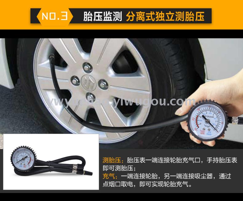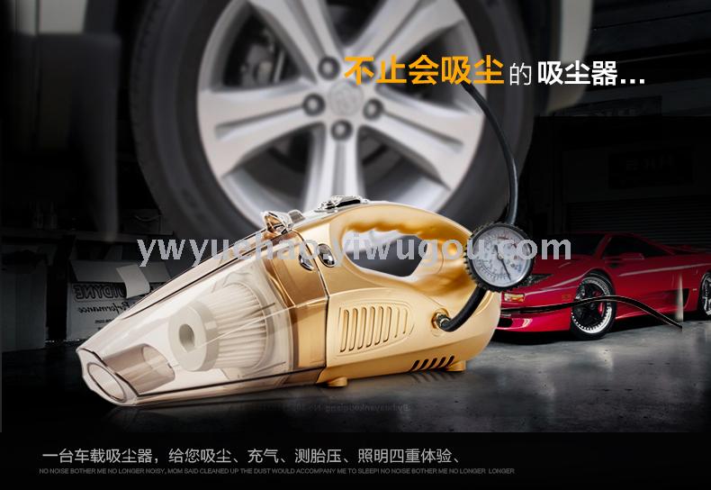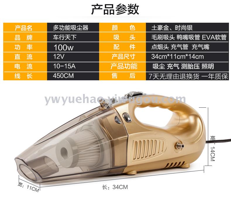 产品:四合一吸尘器(吸尘,充气,照明,测胎压) 功率:100W 直流:12V 线长:约4米 重量:约1.3公斤 配置:毛刷,鸭嘴,软管,充气软管。