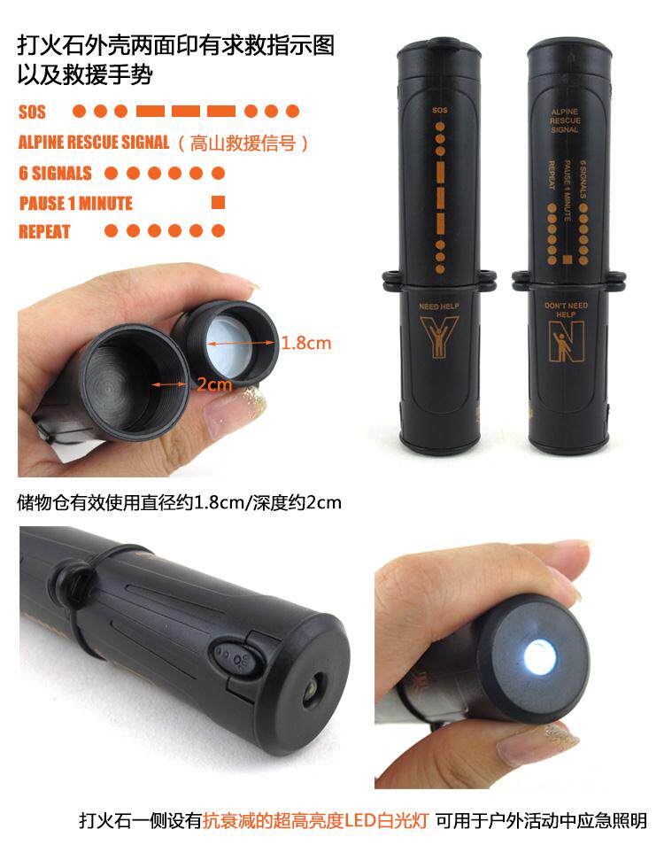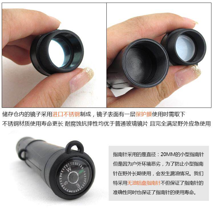 产品特点: 镜子是采用进口不锈钢镜子材料做成的,上面是有层保护膜的,用时要取下保护膜。 指南针采用的是直径:20MM的小型指南针,但是因为户外环境恶劣,为了防止时间长,指南针漏油现象,我们采用的是无油铝盘指南针,指南针的方向都是非常准确的。 LED灯采用的是抗衰减的超高亮度的LED灯,非普通的LED。