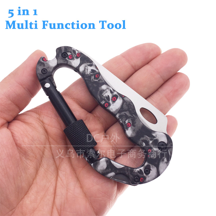 品名:枫叶迷彩骷颅头五合一户外多功能登山扣快挂扣 刀锯十字螺丝刀一字螺丝刀登山扣