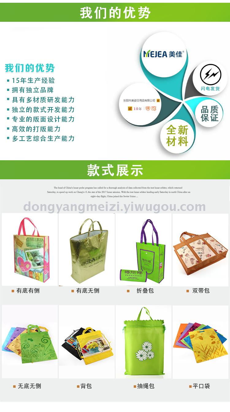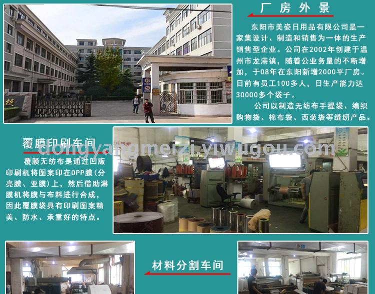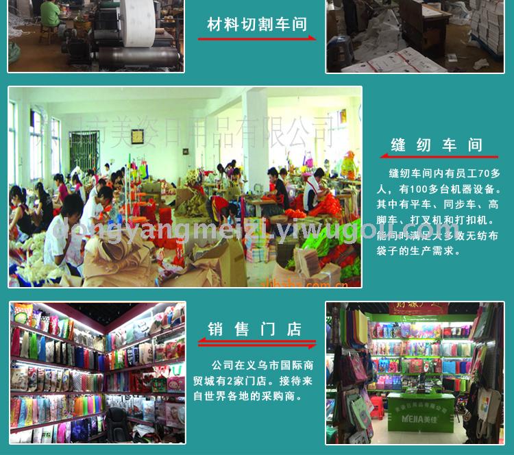 • 东阳美姿日用品经营大类::无纺布袋..编织袋.冰包.棉布袋. 牛津袋.背包.束口袋.帆布袋. 沙滩包.学购物袋.礼品袋.麻袋.面积:14.4平方,主营商品:无纺布袋 。欢迎新老客户咨询采购