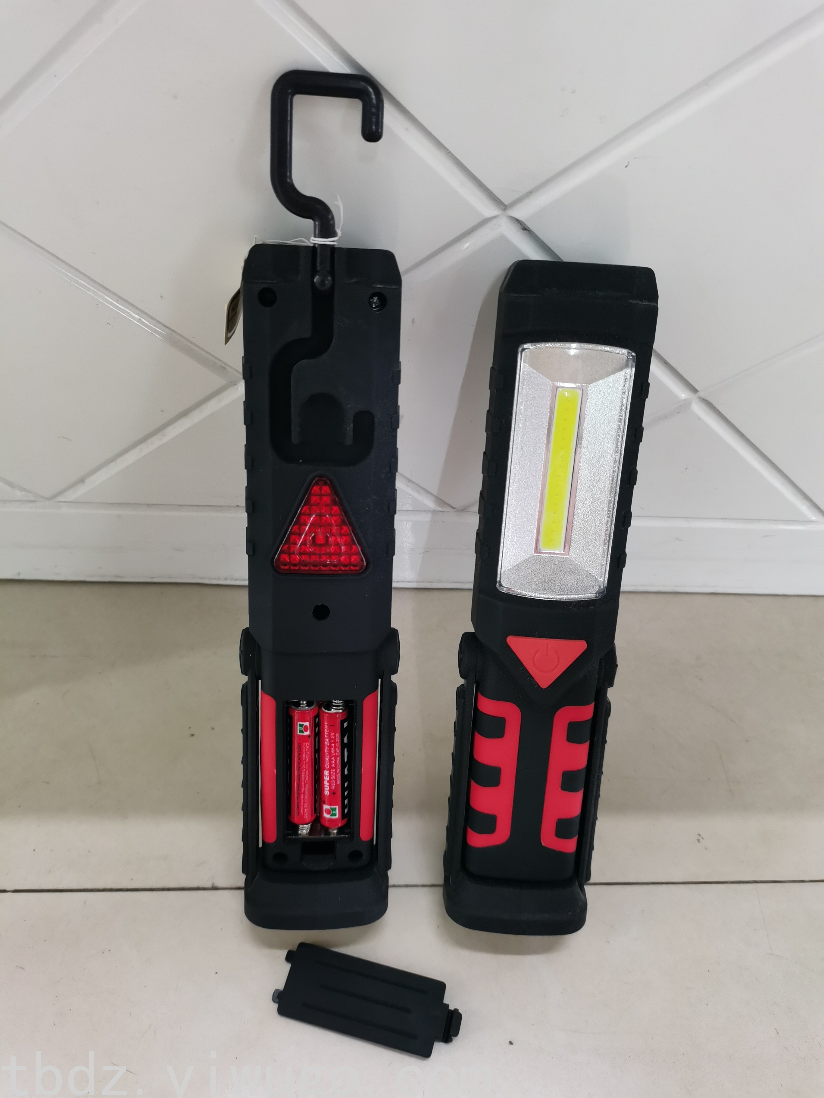 热销COB工作灯手电筒,新款高亮度大功率工具灯,COB光源加头部1个强光灯泡加背面3LED红灯,ABS材料使用3个AAA电池,外壳加软喷处理,手感舒适,250流明PC透明镜,使用寿命10万小时左右单独彩盒包装,产品底部带强磁,背部有挂钩。强磁可以吸附在文件柜与铁质物质上,挂钩可任意角度旋转,使用方便,一箱120PCS.