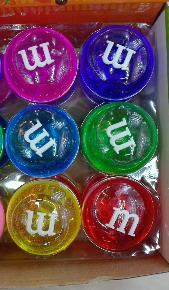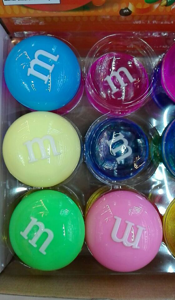 M巧克力豆水晶拉面土,有实色和透明两款,6色混装,直径6CM的24一彩盒,480一件;直径7.5CM的240一件