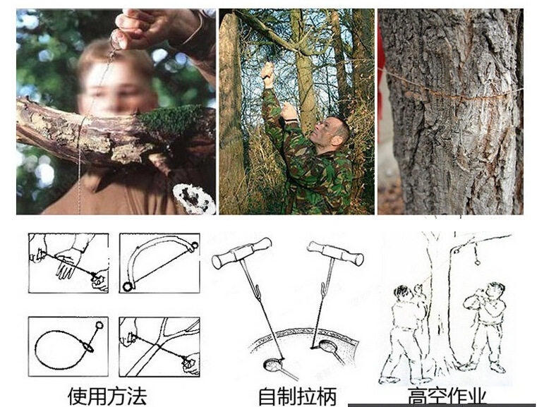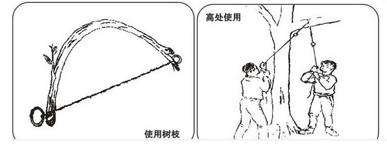 ※ 单手使用方法:先切一段大拇指粗细,比锯身长10CM左右的树枝,在树枝两端各做一个切口,将拉环插入一端切口,将树枝弯曲,将另一拉环插入另一切口,即可做成一弓型的手锯。