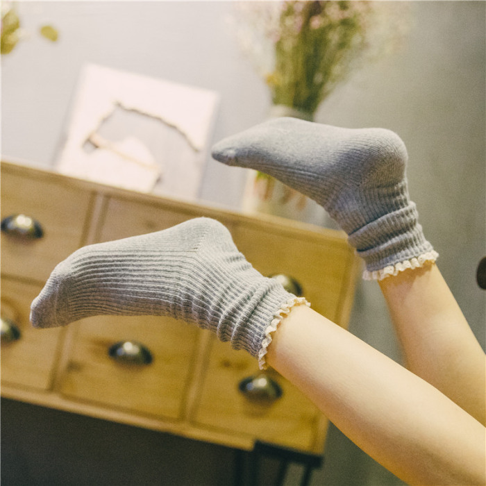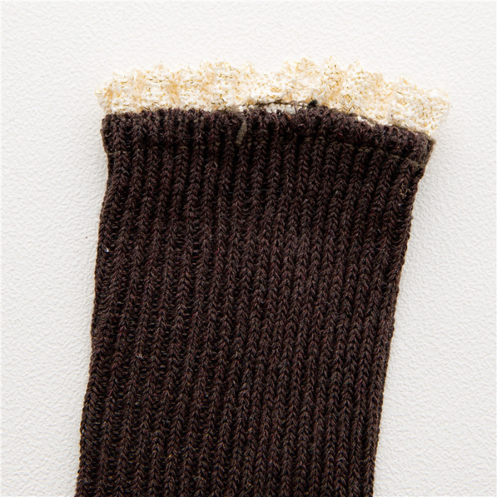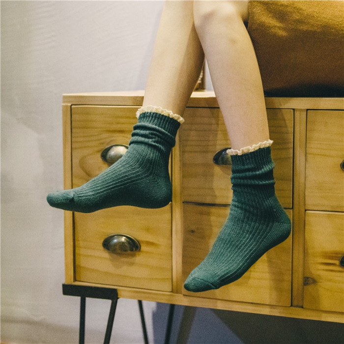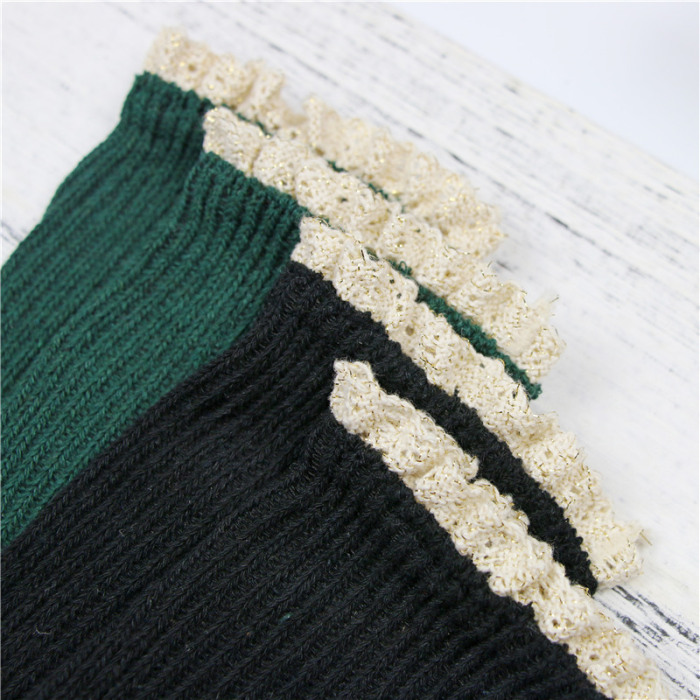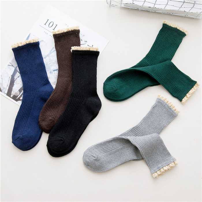 学院风纯色甜美花边双针中筒袜棉袜堆堆袜爆款冬加厚保暖袜批发