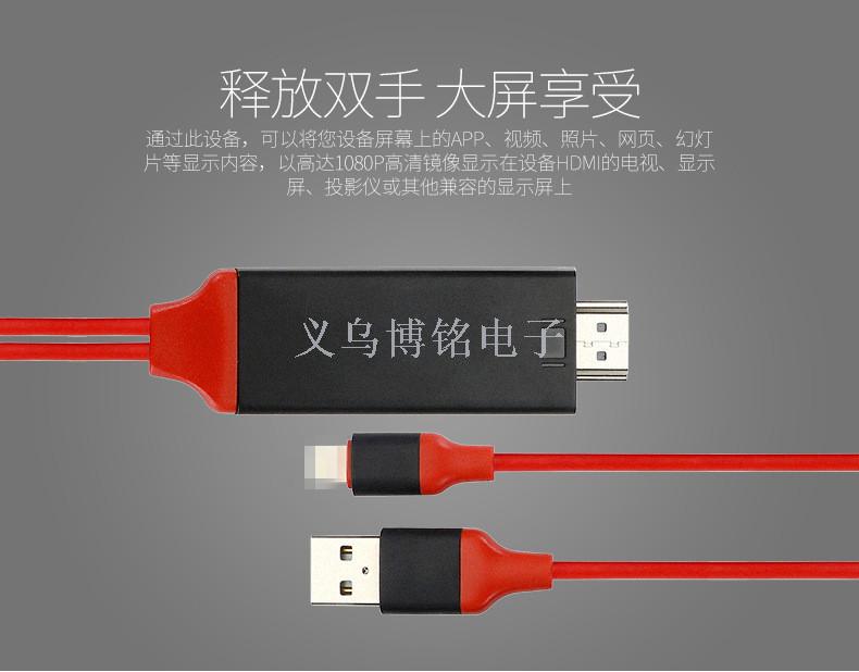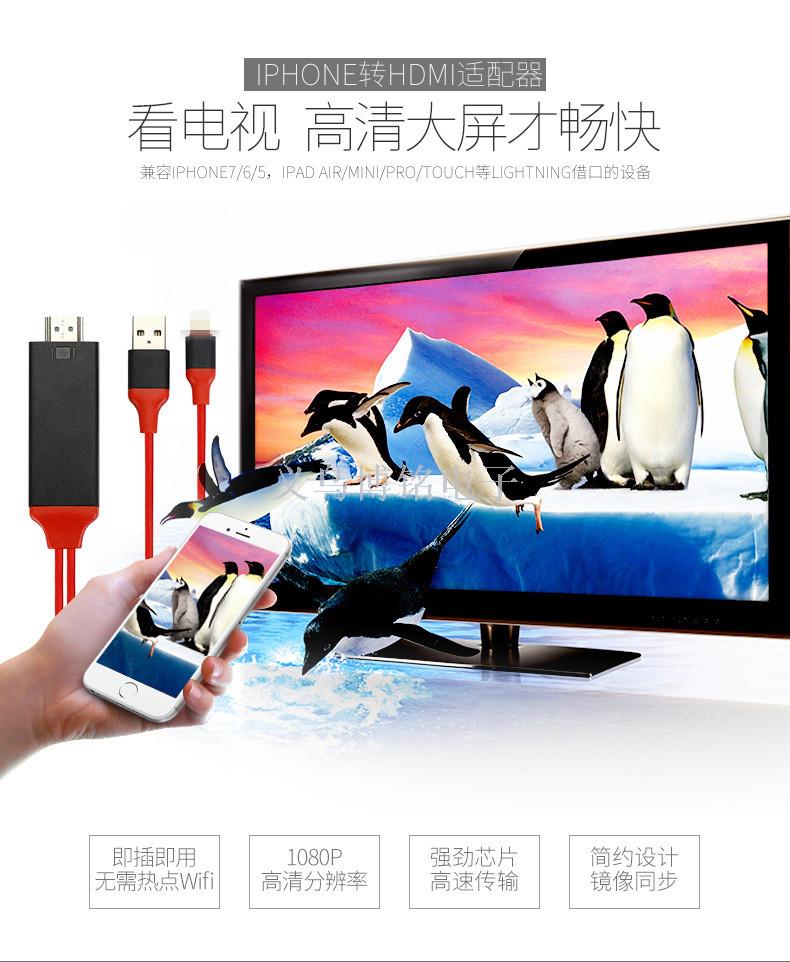 可以实现将iPhone5/5s/6/6s/6plus/6splus 7.7plus/ipad4/ipad mini连接到高清电视。实现全数字画面,比VGA模拟信号更强更稳定,支持1080P 即插即用,无需热点设置和WIFI环境, 无需越狱,直接支持输出!8PIN苹果接口,适用于苹果手机,实现苹果手机小屏变大屏,将手机屏内容放大投射到电视机,其它大屏多媒体屏幕上。