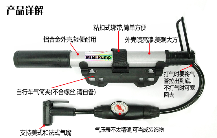 适合美嘴和法嘴 方便携带 可挂车架 带有气压表(气压表不准哦 可以理解为装饰物 ) 铝合金 外涂高亮度漆