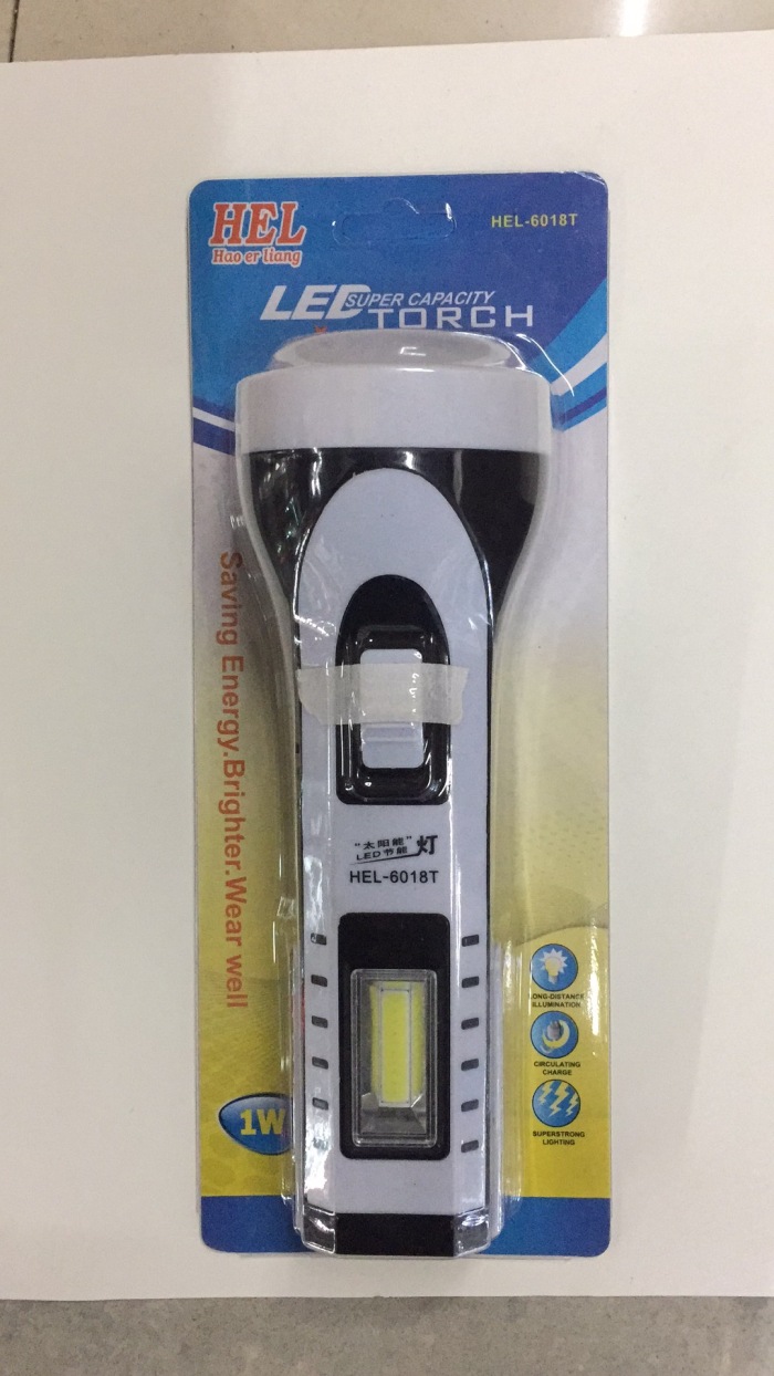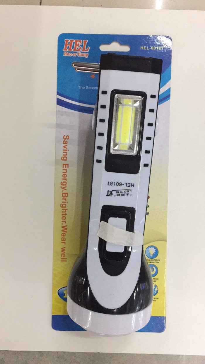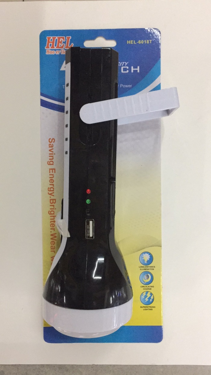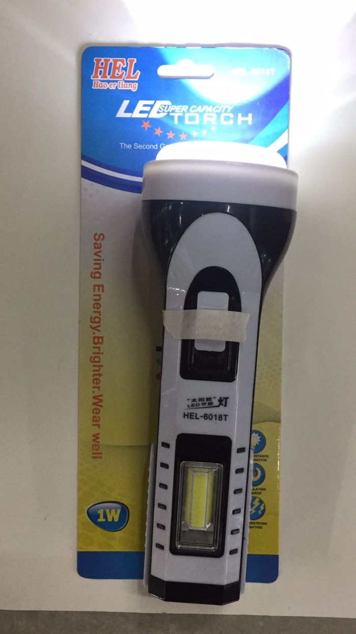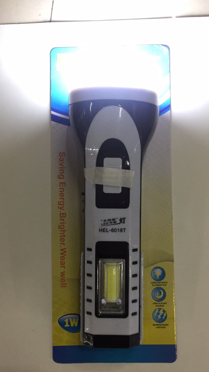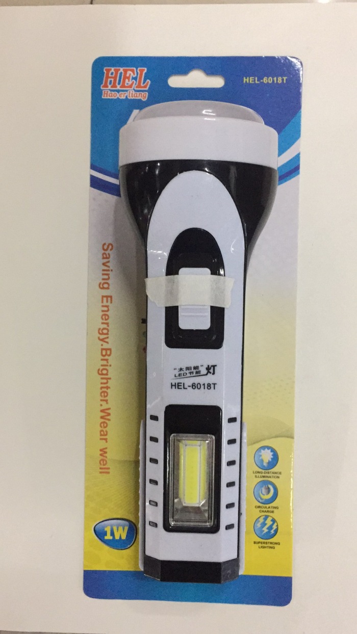 型号:HEL-6018T 一件120只,前面为1W强光LED做光源,灯罩是5730灯珠:有55流明,侧边为COB灯光,可以做台灯使用,打开边上黑色的开关,漏电开关之后,绿灯指示灯亮,可以给手机应急充电,是野外给手机应急充电的绝佳良品,当然他内置电瓶毕竟有限,尽量不要当做手机的充电宝使用