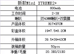 | 功能描述 | 支持TF/USB/AUX/收音 | 装箱数量 | 50PCS | ||