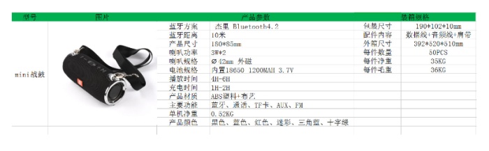 包装内容:蓝牙音箱,USB充电线,音频线,包装盒