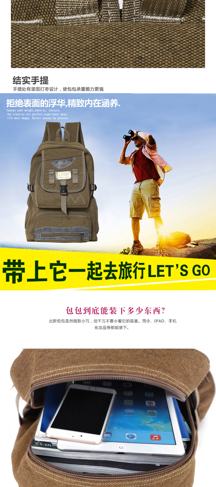 我厂主要生产经营各种帆布和牛津布背包 休闲包 电脑背包 腰包 胸包 腿包 学生背包 书包 挎包 斜挎包 户外包 登山包 健身包 旅行包 电脑手提包等等,我厂凭借着可靠的质量、精良的工艺、合理的价格和优质的服务,产品深受国内外广大客户的青睐。本着“客户第一,诚信至上”的原则,与多家企业建立了长期的合作关系。