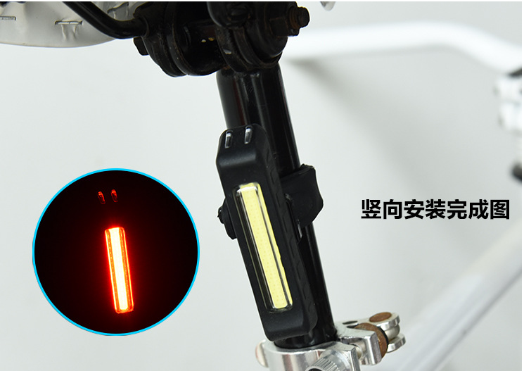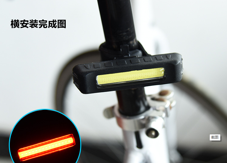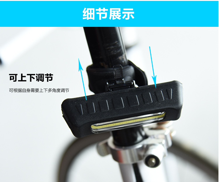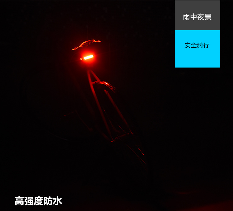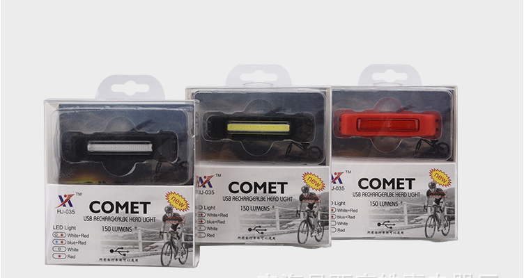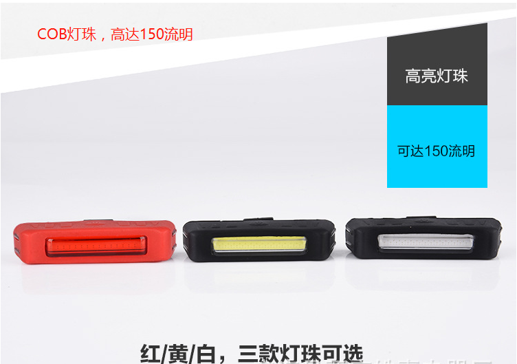 型号:HJ-035 名称:夜骑自行车尾部灯 充电时间:3小时 灯珠:COB 灯珠 续航时间:2-8小时 流明:可达150流明 充电方式:USB直充充电 重量:45克 使用电源:内置500毫安电池 模式:三款灯光模式可选