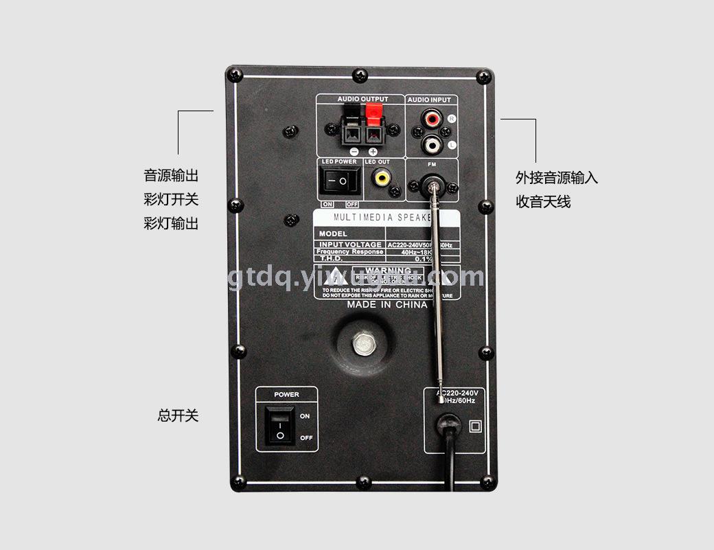 U盘、SD卡、FM收音、均衡器、彩灯、音量调节、外接电源
