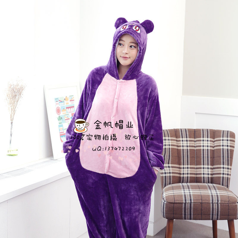 冬季动物连体睡衣卡通紫猫法兰绒成人儿童家居服如厕版