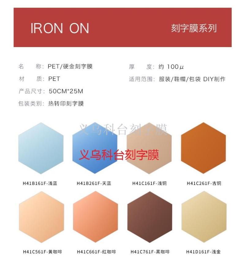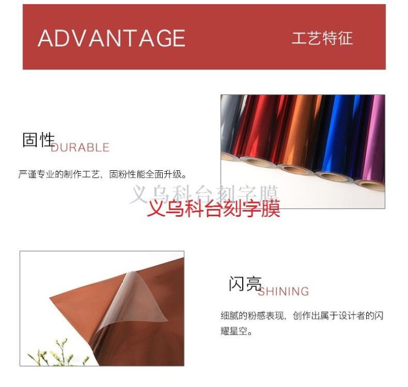 1:PET刻字膜,热转印膜,品种繁多,色彩绚丽,清晰柔和。