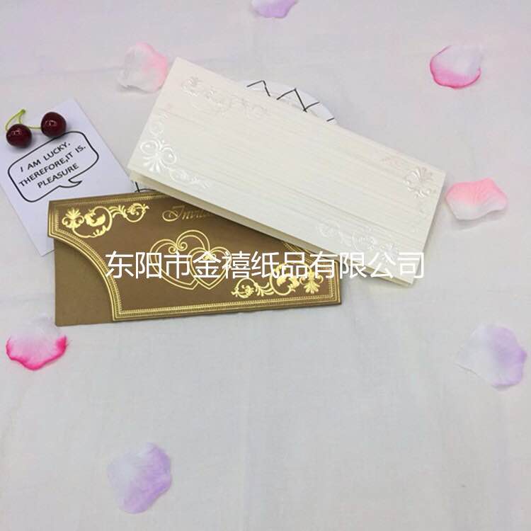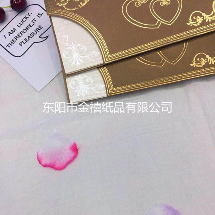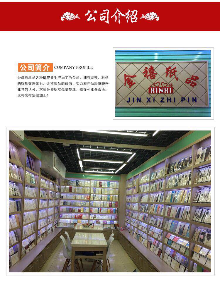 • 金禧纸品厂家直销。主要生产各种中高档请柬、邀请函、红包、结婚请柬、礼簿等国内外纸类产品,也可以根据客户要求、来样定做。本厂的产品质量保证,价格合理。欢迎国内外新老客户光临。