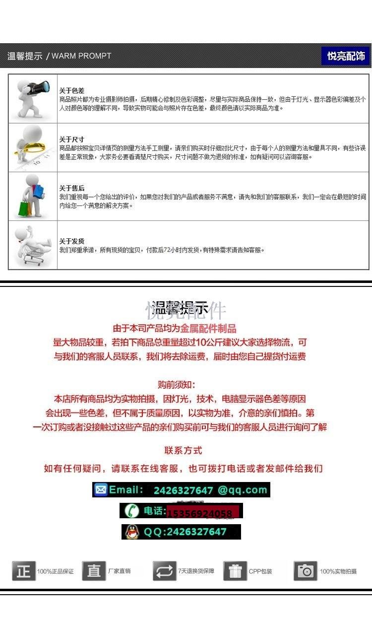 购前须知: 本店所有商品均为实物拍摄,因灯光,技术,电脑显示器色差等原因,会出现一些色差,但不属于质量原因,以实物为准,介意的亲们慎拍。第一次订购或者没接触过这些产品的亲们购买前可与我们的客服人员进行询问了解。