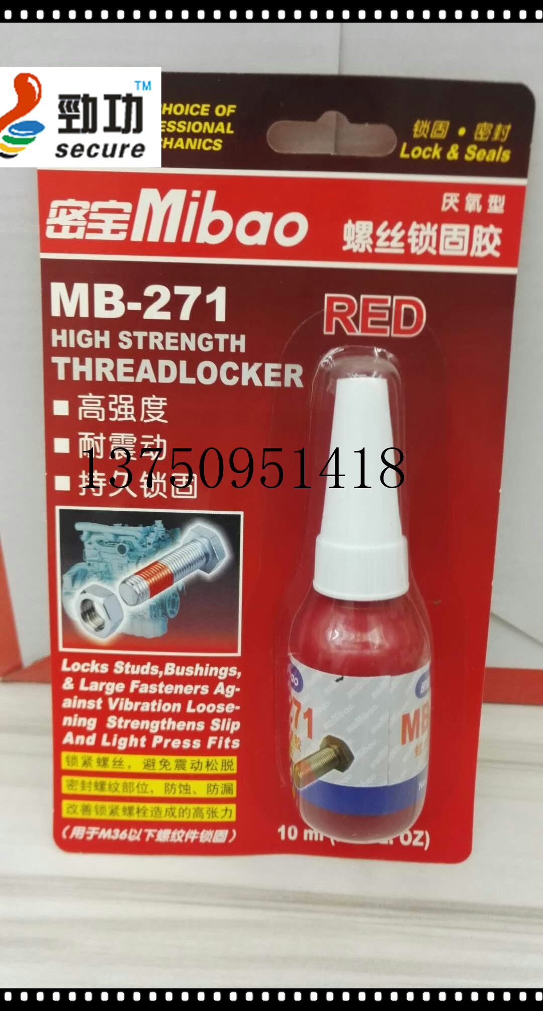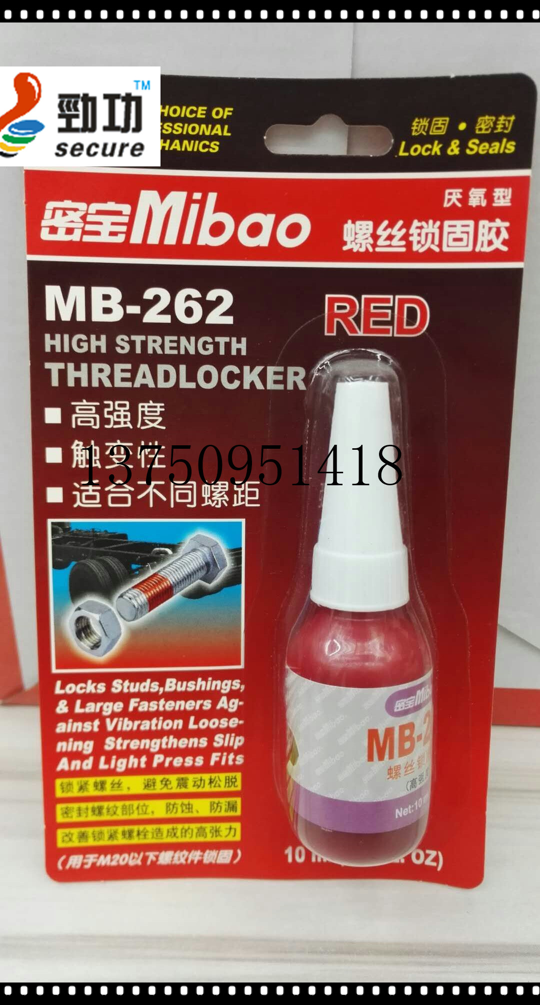 | 用于M36以下螺纹紧固件的永久锁固与密封,防止螺纹锈蚀。典型用途:双头螺柱拧入端锁固(如汽缸头双头螺栓)。 | ||