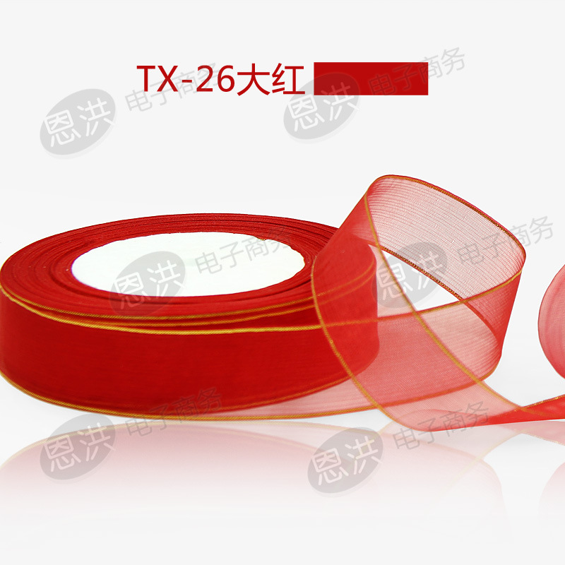 公司产品有:缎带、金边缎带;纱带、金边纱带、粗边纱带、宽边纱带、提花纱带;高品质涤纶带;罗纹带;金、银葱带;丝绒带;印花带及各种异型带等等。同时也可以按客户样品来样生产。