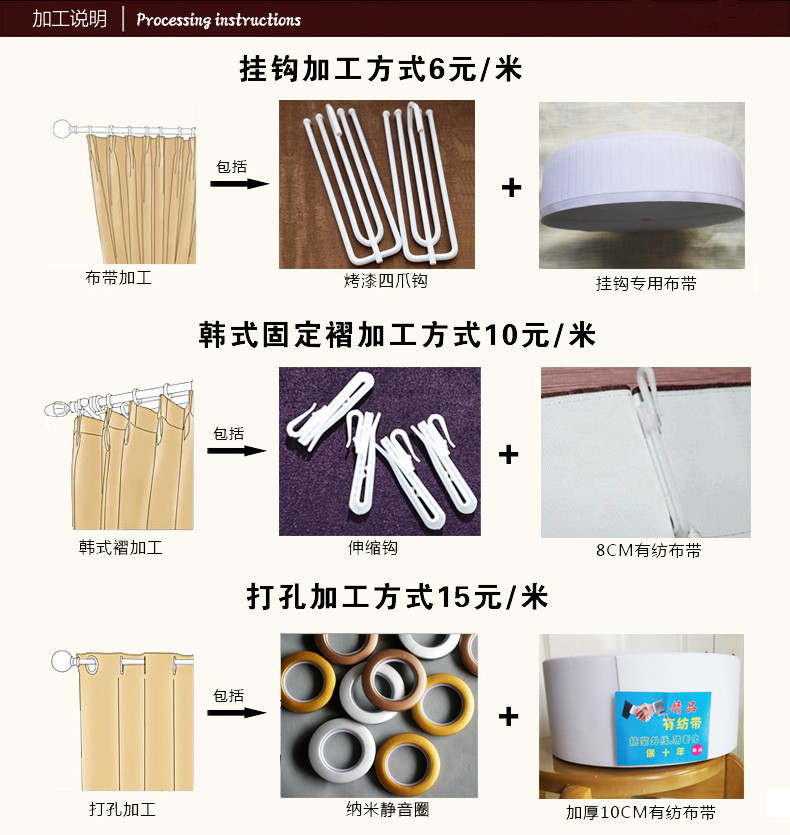 关于成品:挂钩加工10元/米。打孔加工15元/米。纳米圈打孔加工15元/米。韩式褶皱15元/米 为保证买卖交易愉快,请买家务必阅读以下内容