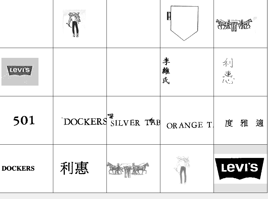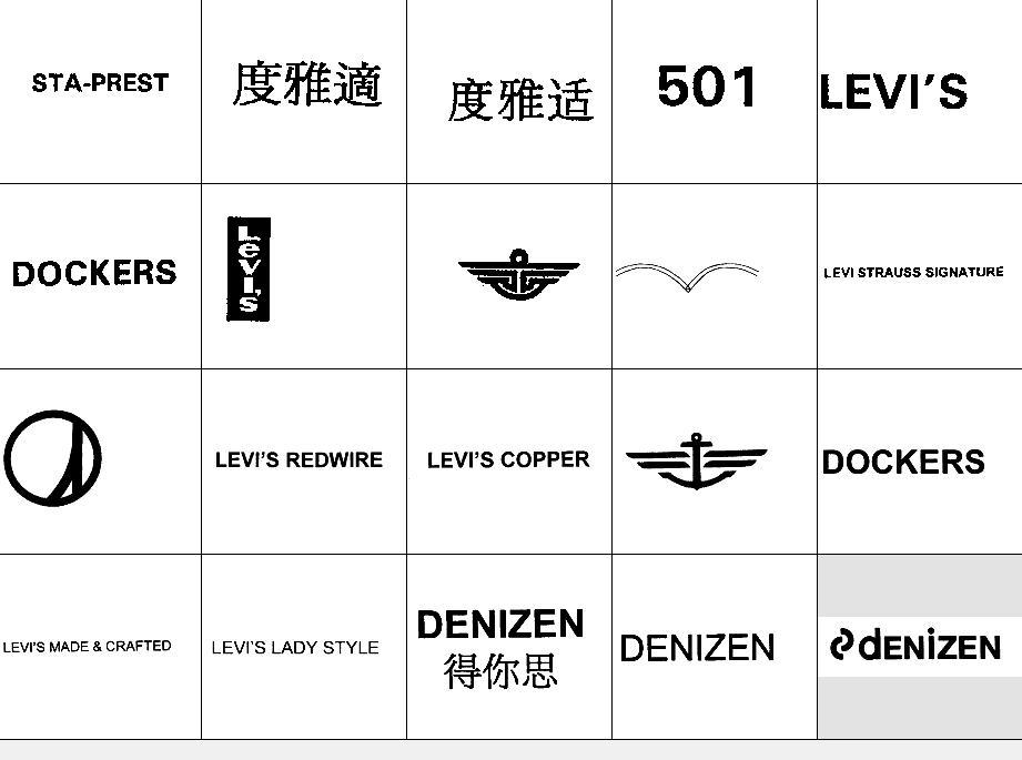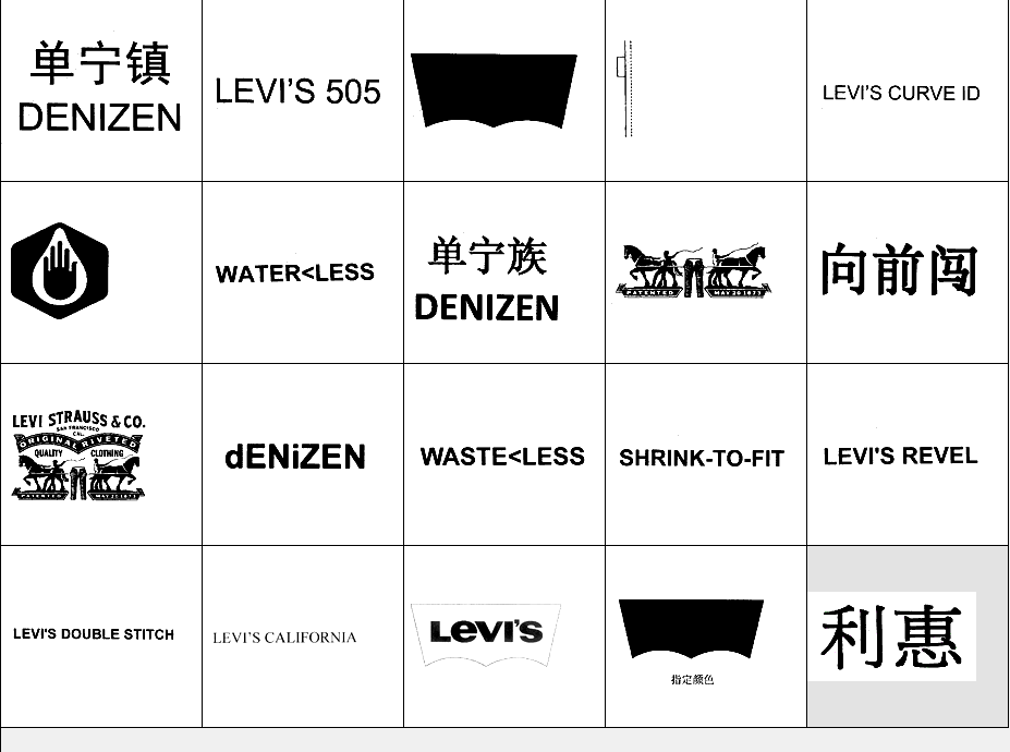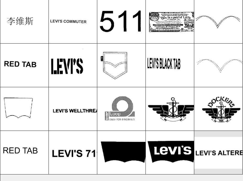 以下图形为李维斯(Levi's)常用商标图形,均已在中国商标局注册,利惠公司获得商标专用权。他人未经许可在服装类产品中使用与其相同或近似图形易构成侵权,需承担法律责任。希望各位市场经营户注意识别!