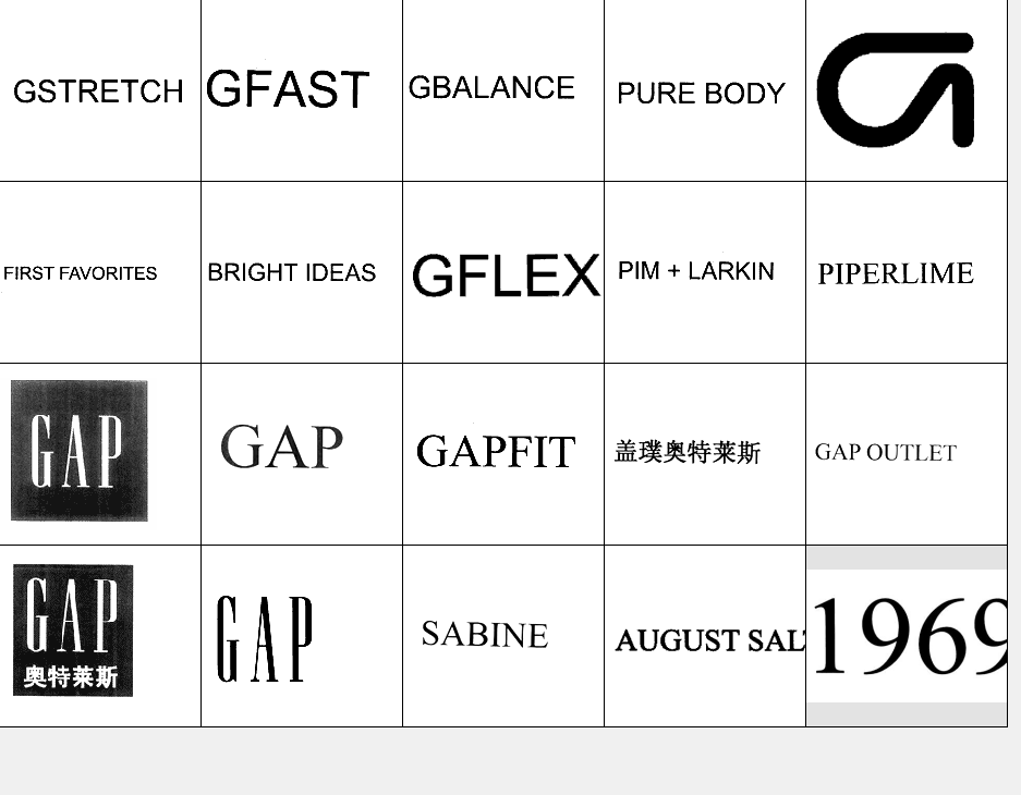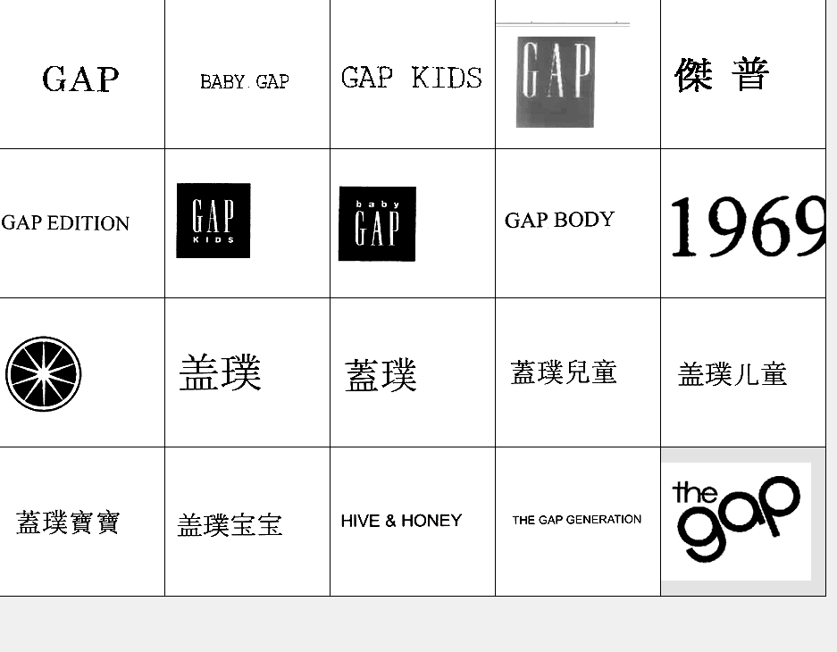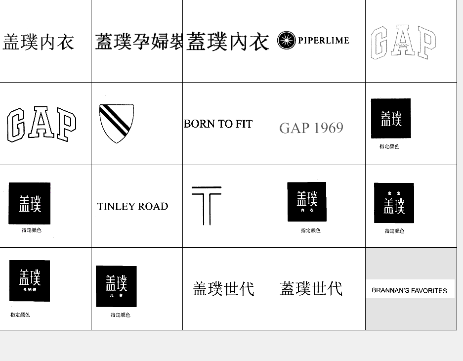 以下图形为GAP常用商标图形,均已在中国商标局注册,盖璞(国际商标)公司获得商标专用权。他人未经许可在服装类产品中使用与其相同或近似图形易构成侵权,需承担法律责任。希望各位市场经营户注意识别!