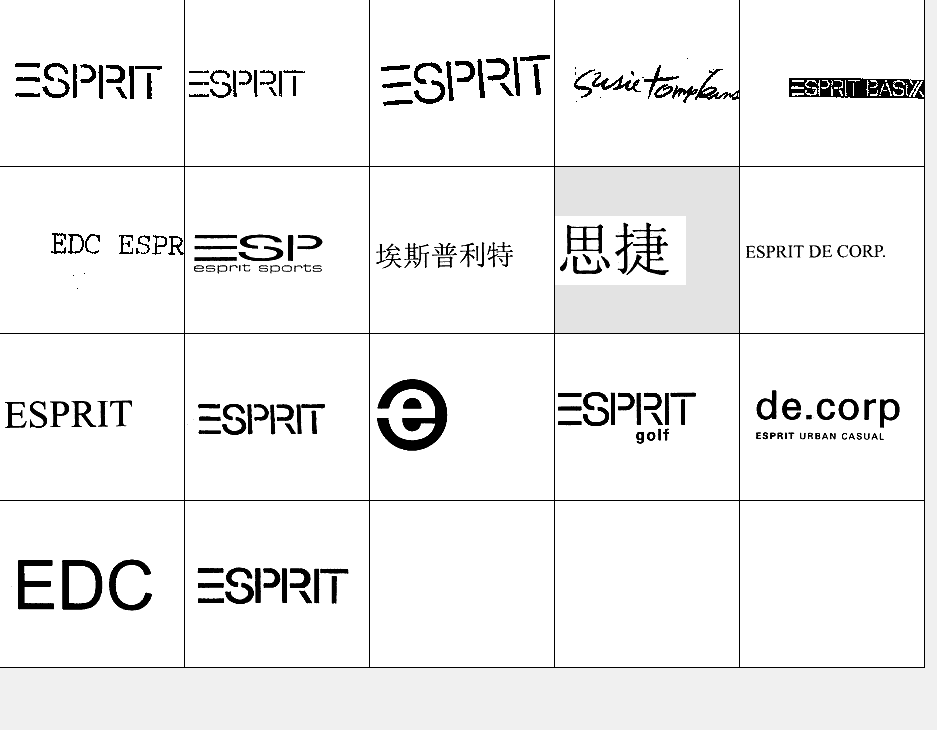 以下图形为ESPRIT常用商标图形,均已在中国商标局注册,埃斯普利特国际公司获得商标专用权。他人未经许可在服装类产品中使用与其相同或近似图形易构成侵权,需承担法律责任。希望各位市场经营户注意识别!