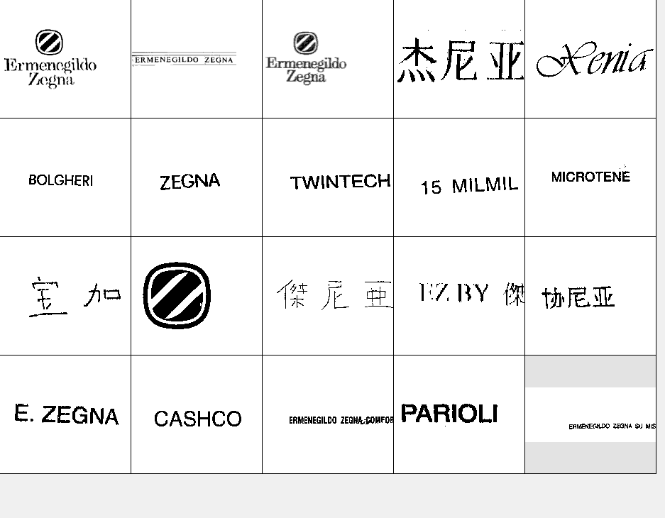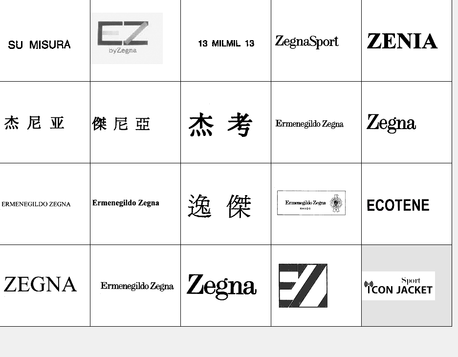 以下图形为杰尼亚 (Zegna) 常用商标图形,均已在中国商标局注册,康恩泰有限公司获得商标专用权。他人未经许可在服装类产品中使用与其相同或近似图形易构成侵权,需承担法律责任。希望各位市场经营户注意识别!