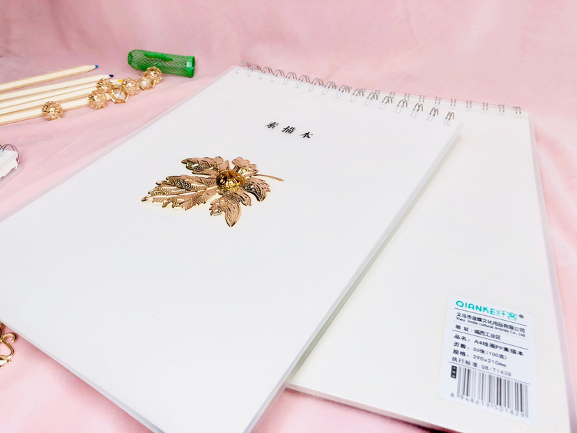 ? ?品? 名:纤客A4PP工艺上翻素描本 ? ?型? 号:A4-SM-PP ? ?规? 格:210*285MM ? ?包? 装:单本收缩膜 60本/箱 ? ?细? 节: 封面半透明pp片材 内芯100g 金属片工艺装饰