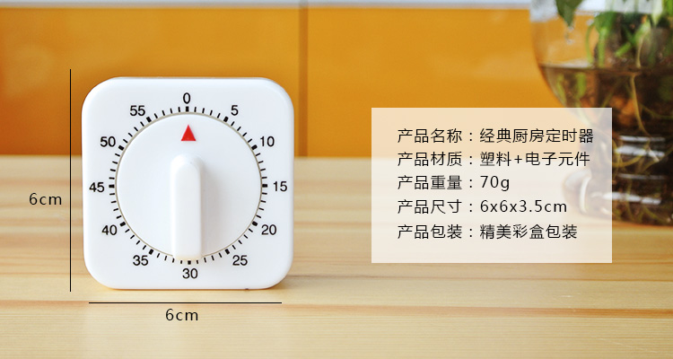 使用说明:将定时器顺时针转一圈至零刻度,再逆时针转回所需的时间,定时器届时会发出清脆的铃声。