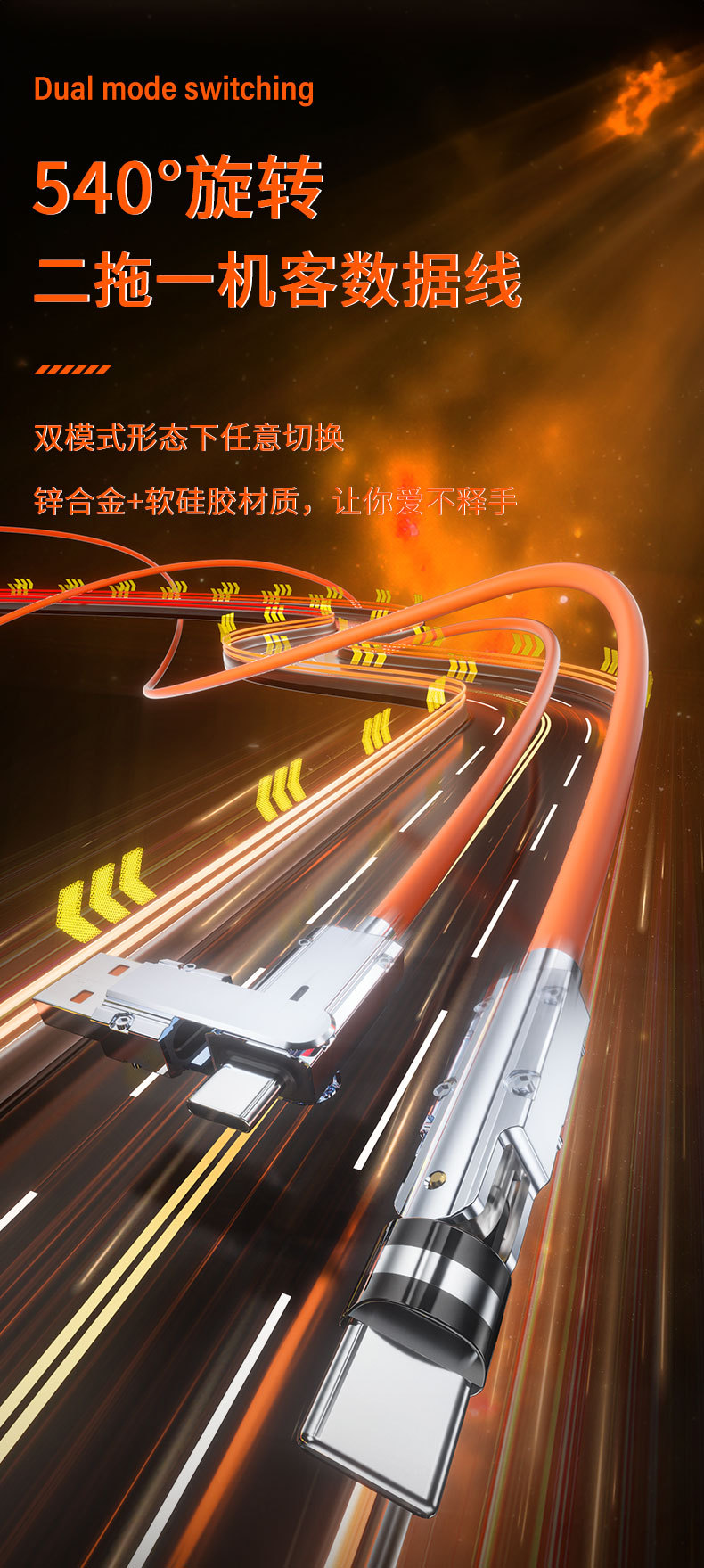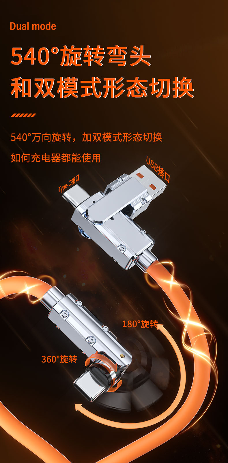 硅胶PD二拖540度旋转快充数据线二合一适用苹果15华为笔记本电脑