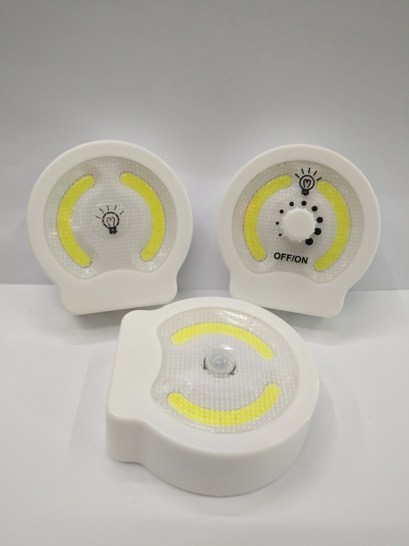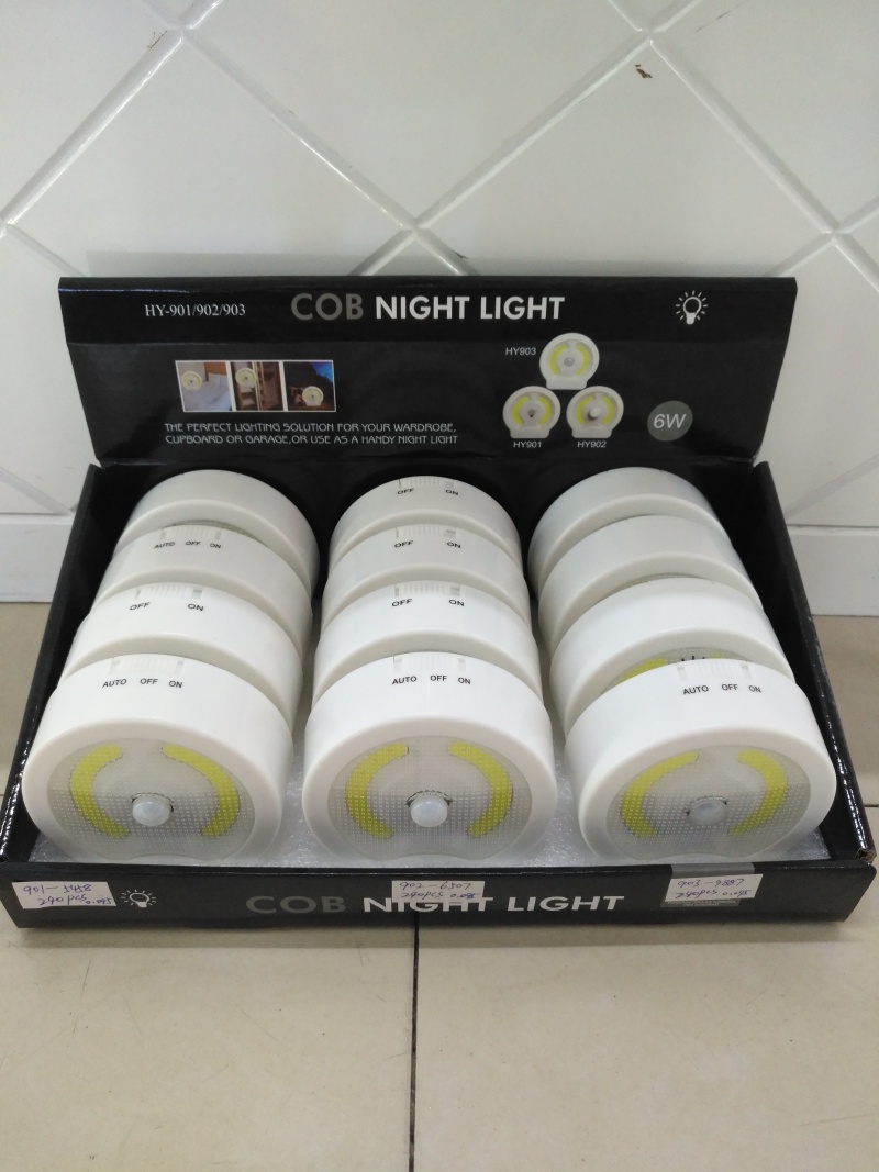 新款感应开关灯小夜灯,ABS材料COB贴片灯珠使用3个AAA电池,在黑暗时人体经过感应灯变亮,当人离开时30-60秒左右自动熄灭,包装有展示盒和单独插卡,一个展示盒12个一箱240个,单独插卡一箱180PCS,这是一款设计新颖价廉物美的小夜灯,欢迎新老客户选购