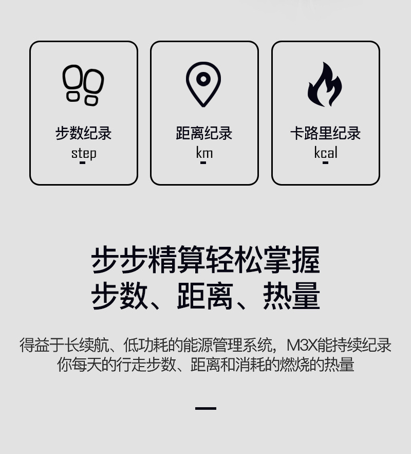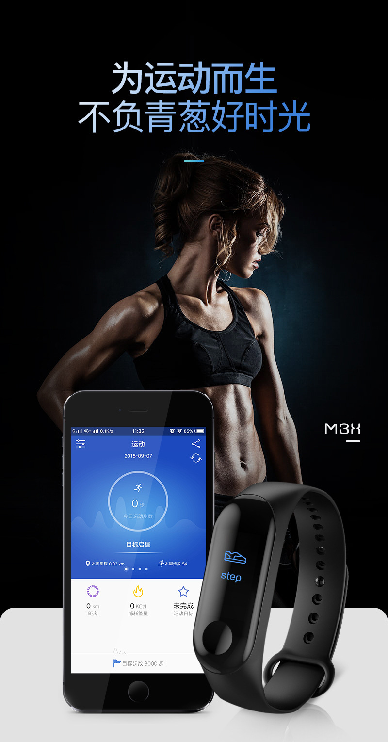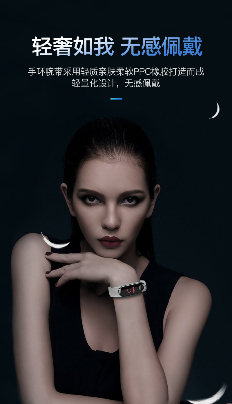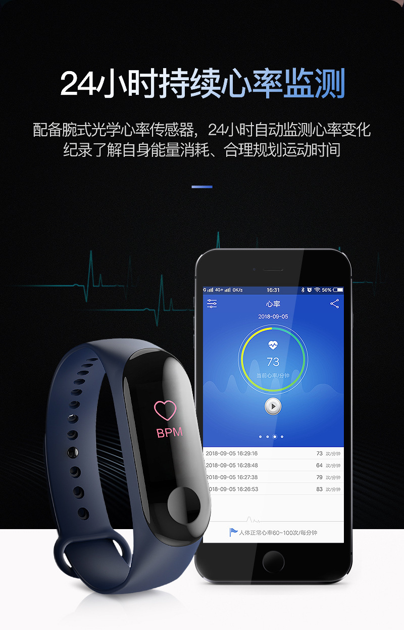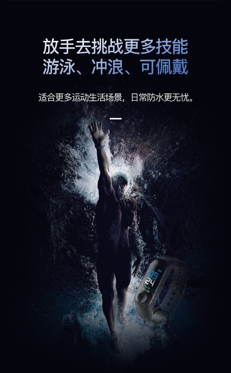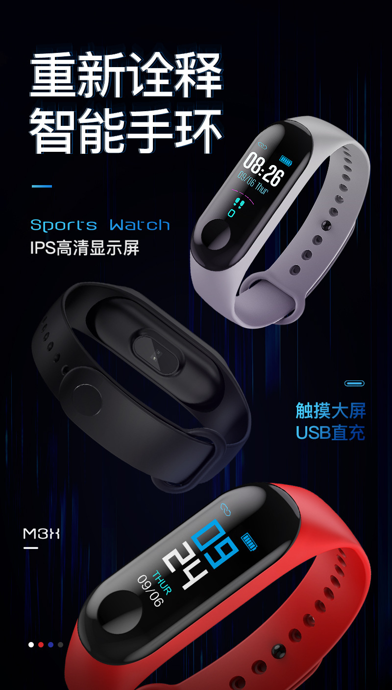 M3彩屏智能手环M3X心率IP68防水血压3代M2睡眠USB直充线充优活APP