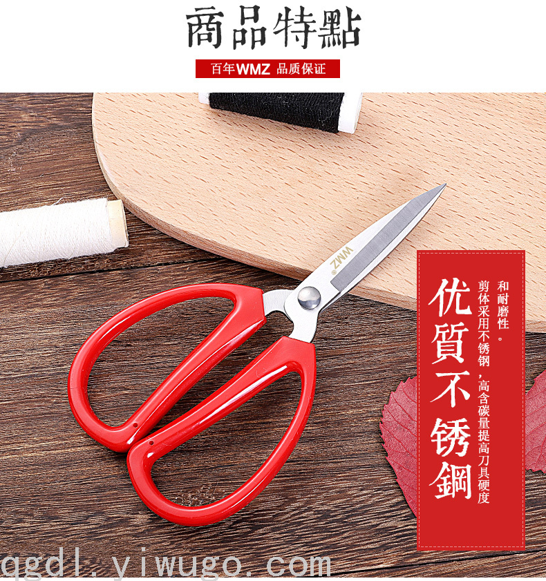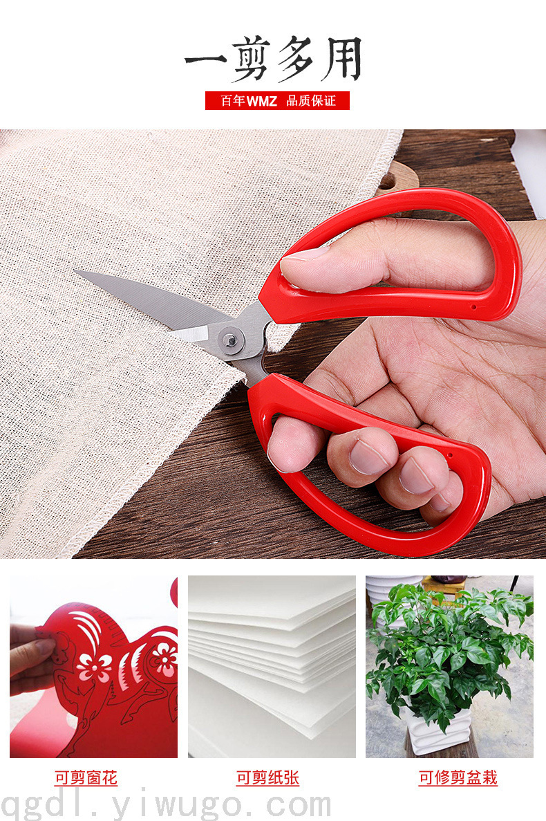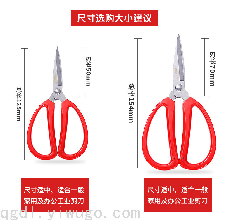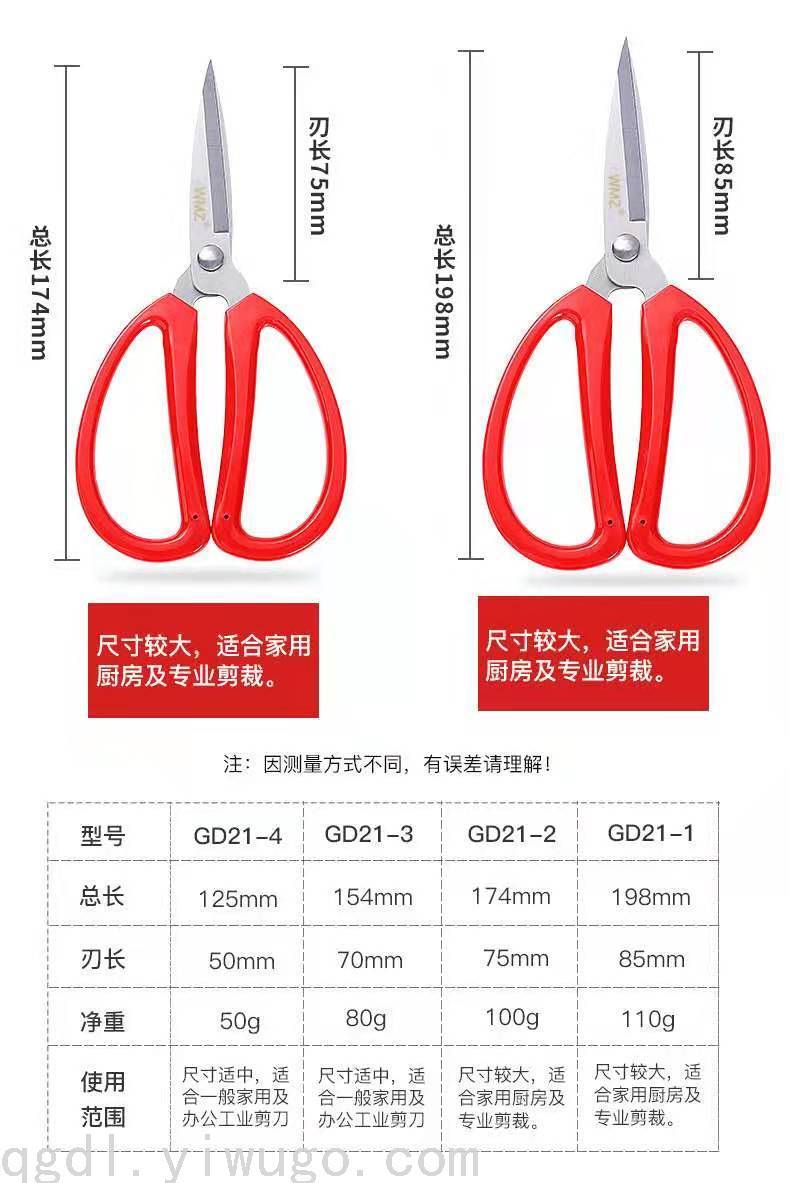 主材不锈钢十ABS组合 做工精细.锋利.外观白红 型号 GD21-1# GD21-2# GD21-3# GD21-4# 产品功能:剪布 纸 线 蔬菜等.范围:家用.酒店用品 包装:插卡单装+彩中合十外箱七层牛皮纸包装组合完善.装箱数量12/合 120/件 注意事项:不要放在小孩危险的地方.以防弄伤.保养:用好用清水和抹布擦干水珠.以防生锈. 致新顾客/常见问题