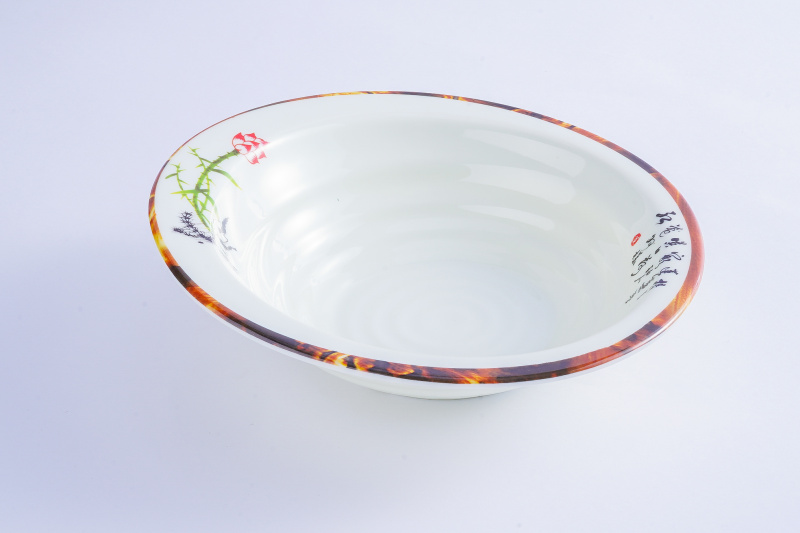 • 美耐皿(100%密胺):其原料为纸浆加入多种化学原料和树脂研制而成,经过高温模具热塑制成,具有陶磁亮丽之外观,建议选用100%密胺产品;耐磕碰、耐高低温,不易摔破,品质好,符合国家食品卫生标准.