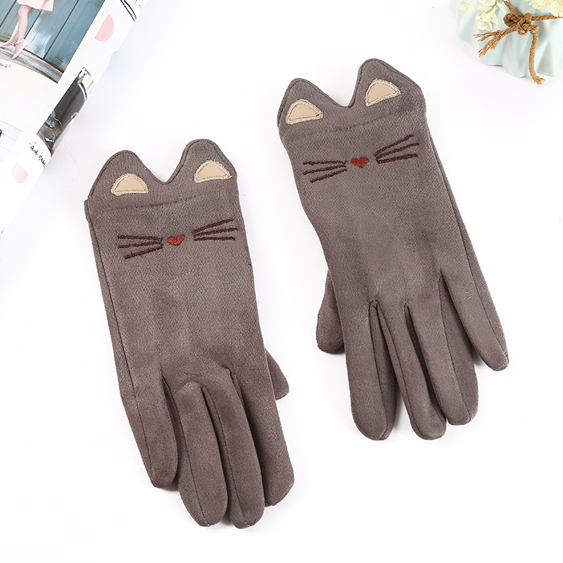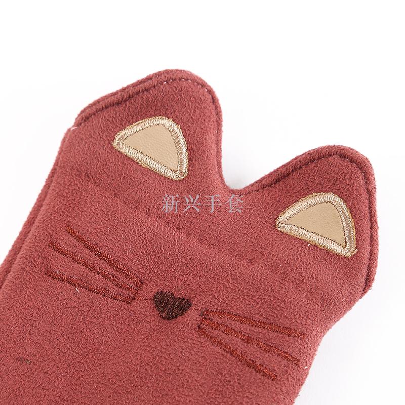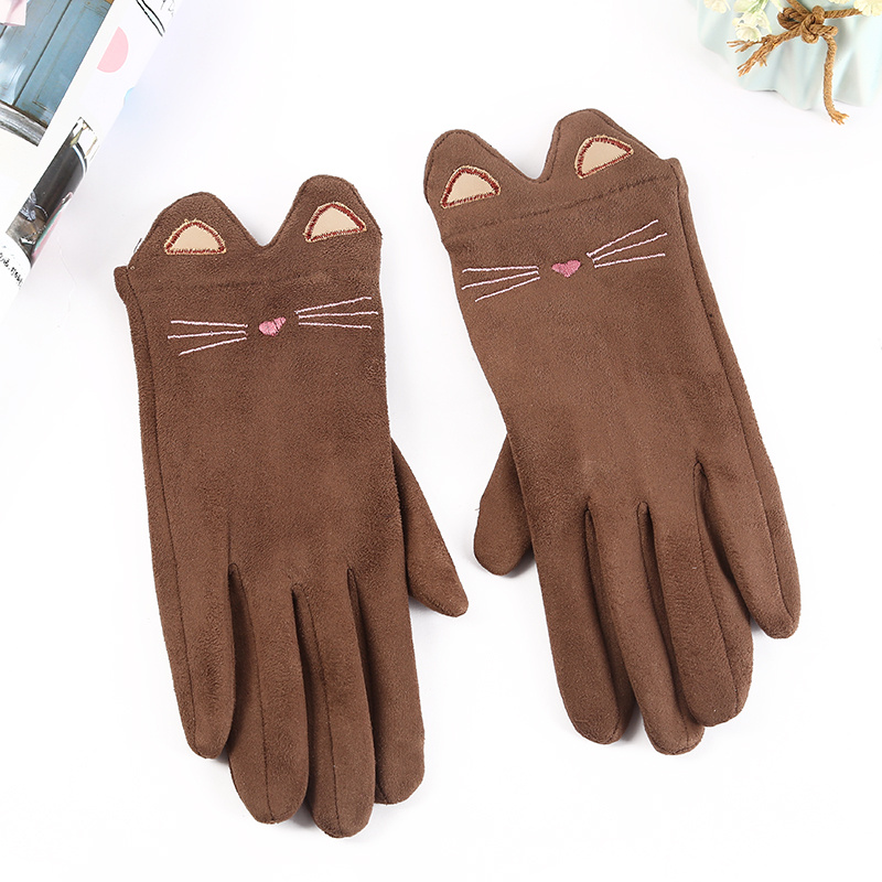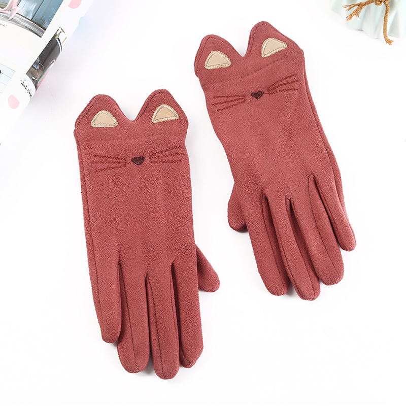 秋冬季可爱女式开车分指手套 麂皮绒猫咪保暖防寒五指纯色手套