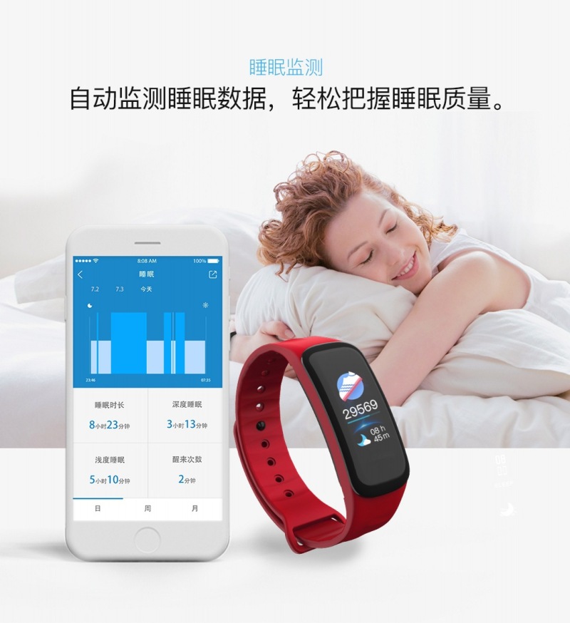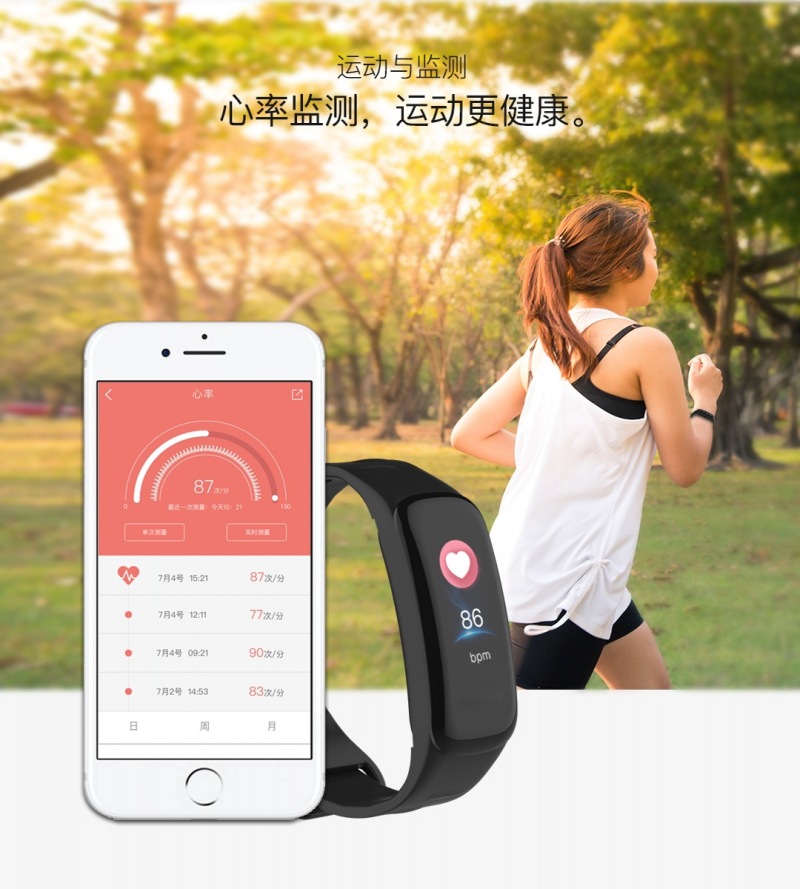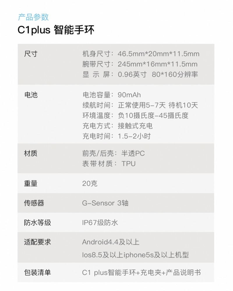• 功能:心率监测、血氧、计步、卡路里、距离、睡眠监测、抬手亮屏、来电提醒、信息提醒、闹钟提醒