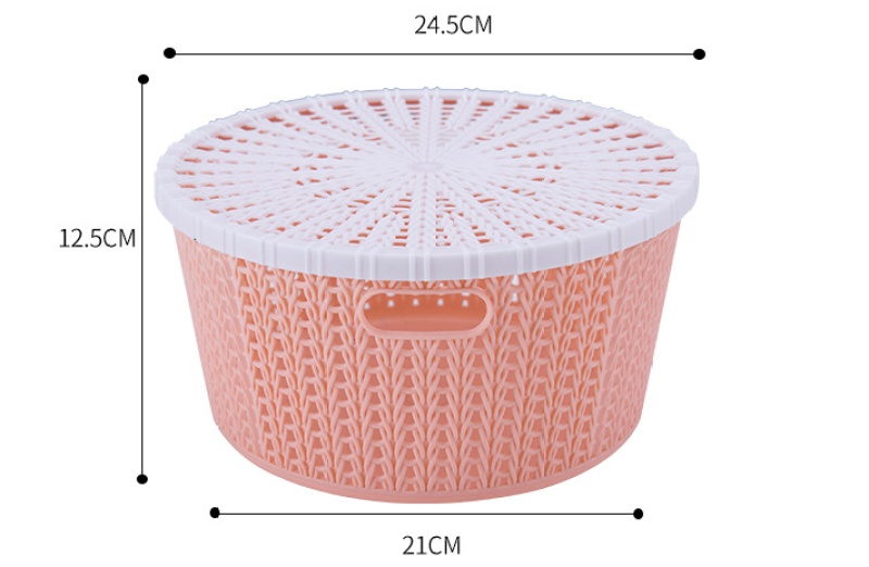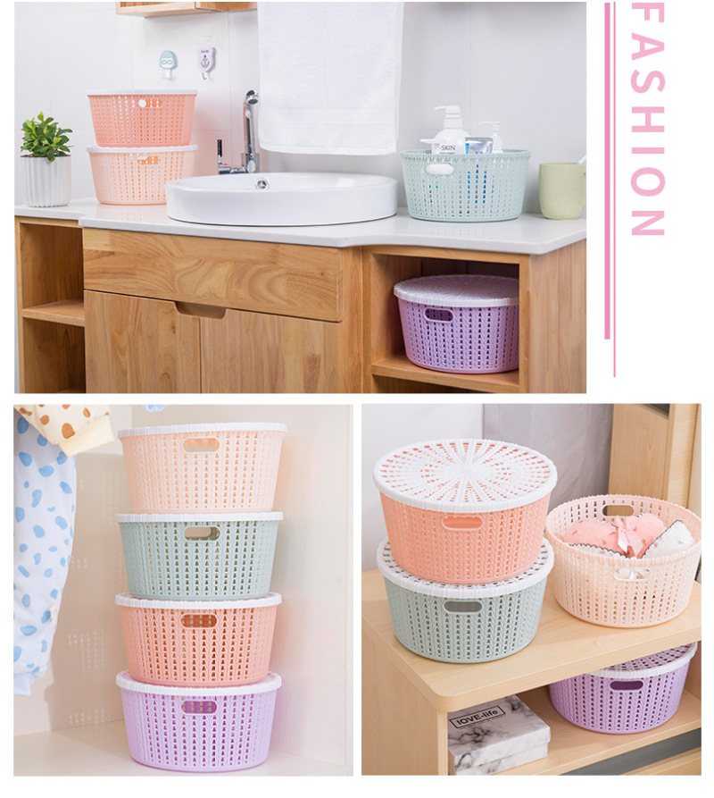 DD家居塑料收纳篮创意圆形仿藤条收纳筐带盖篮子时尚镂空浴筐批发
