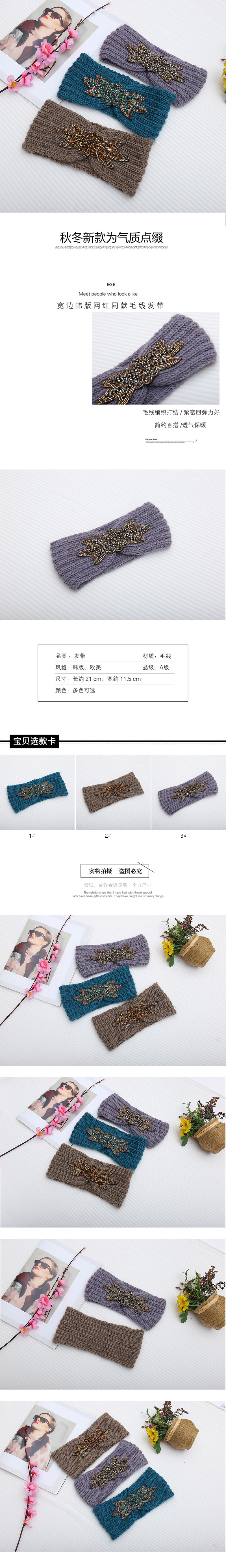 意佳秋冬季时尚毛线发带8条杠水晶花配饰女生针织头带头圈压发巾 投诉