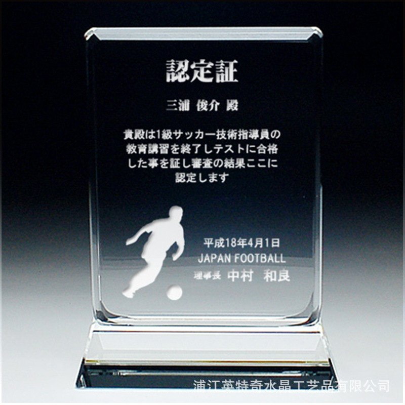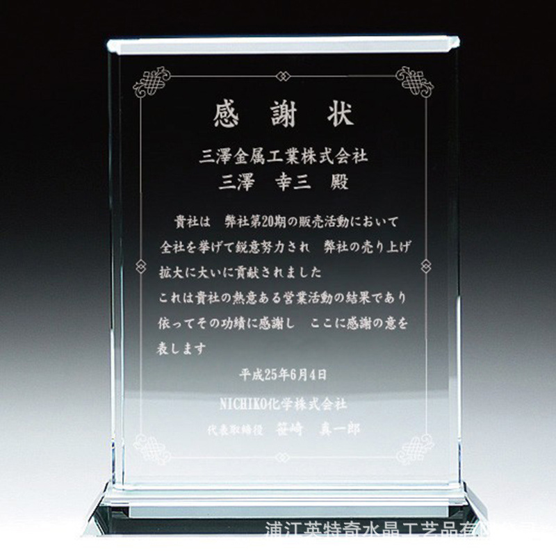浦江英特奇水晶工艺品有限公司是一家集开发、设计、大批量生产.OEM加工于一体的大型水晶制品厂家。本公司秉承:大企业,大品牌,大团队,大格局的发展理念,以质量求生存、以管理求效益、以创新求发展”的企业经营理念,不断吸收加工技术和营销管理经验,发展迅猛。本厂一直致力于开发各种水晶工艺品,各种礼品。并一律采用K9水晶材质,其生产所有产品定制加工或OEM代工的水晶工艺礼品,适于各种商务、酒店、广告礼品,促销礼品,家居摆设品,装饰品,会议庆典赠品,树立公司形象推广,各种促销纪念品,重大庆典活动的纪念品和馈赠亲朋好友的高雅礼品。