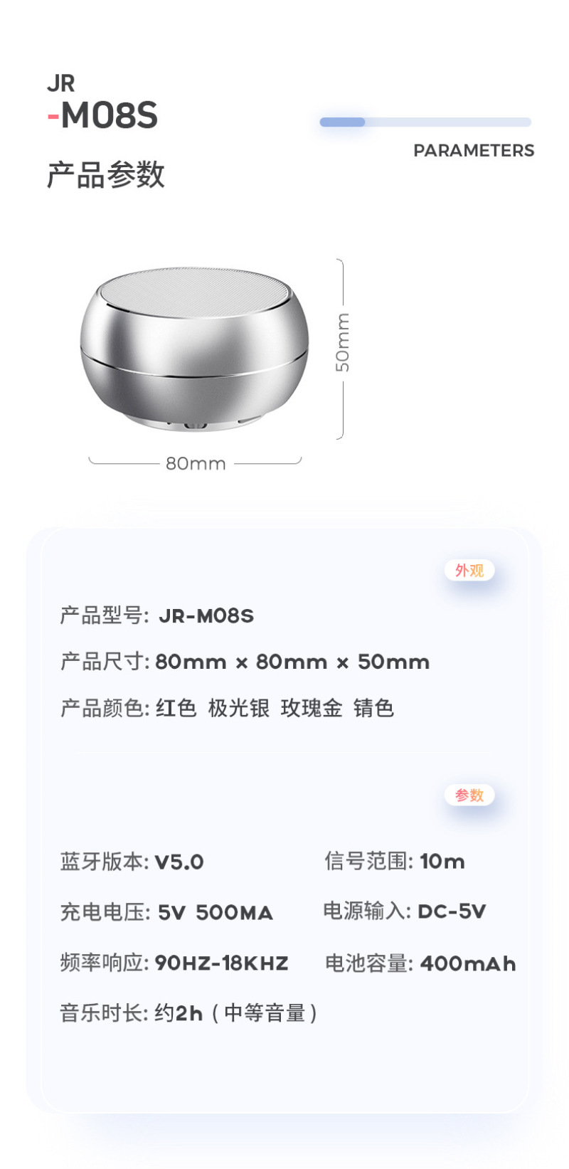 | 频响范围 | 100HZ-20KHZ | 输出功率 | 5V-1A | 信噪比 | ≥75dB |