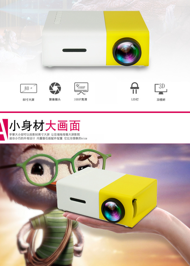 【标配含:投影仪主机+遥控器+电源适配器+三合一AV线+说明书+包装盒】