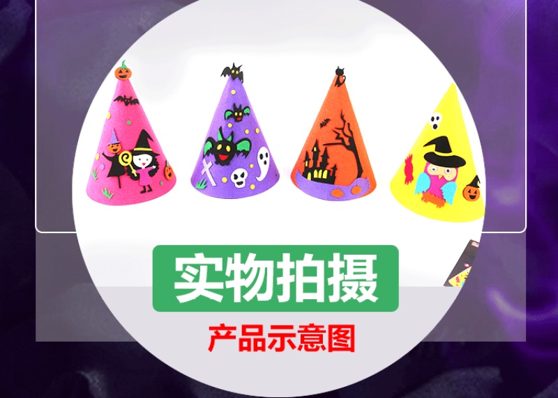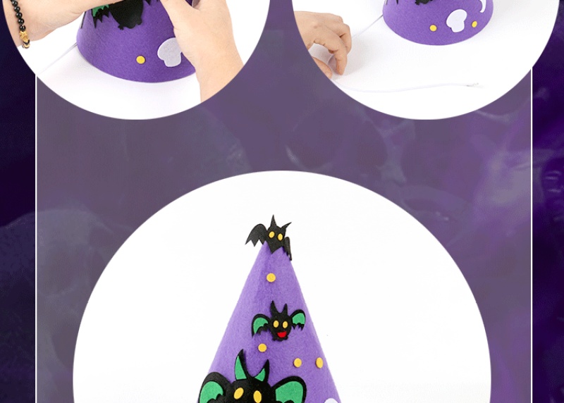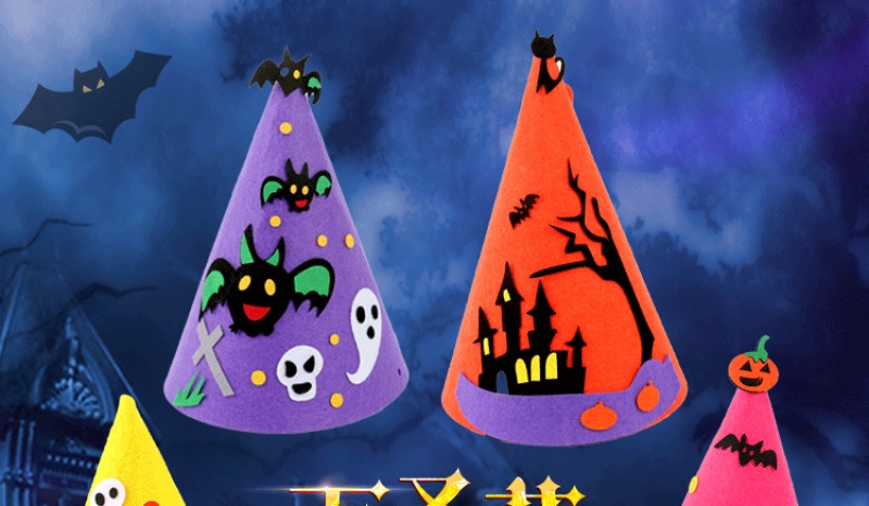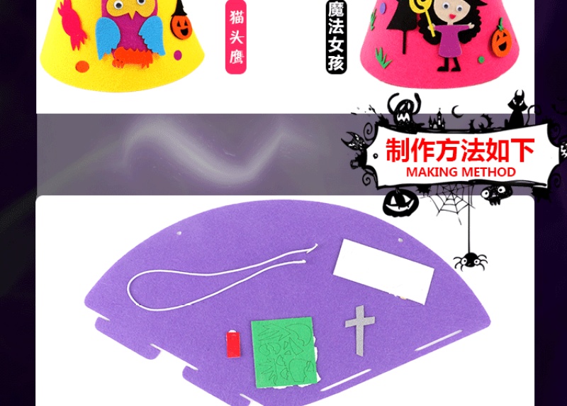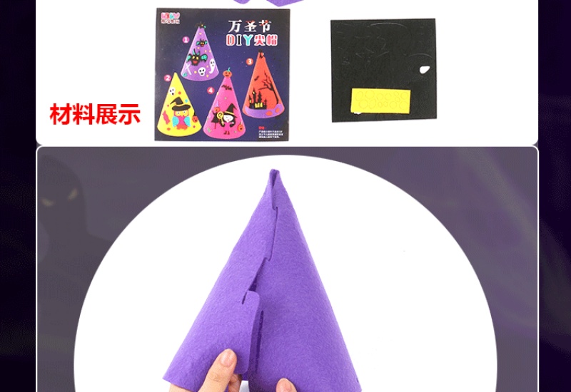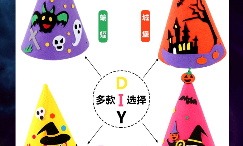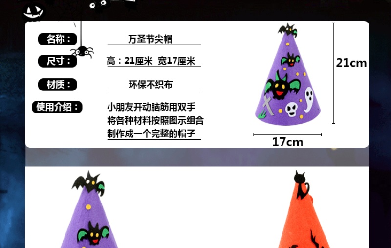 万圣节尖帽 :四个款式? ? 尺寸:高21CM 宽17CM 材质:环保不织布 装箱量400一件 亲收到的是材料包,需要自己动手去做,制作成品更有爱!