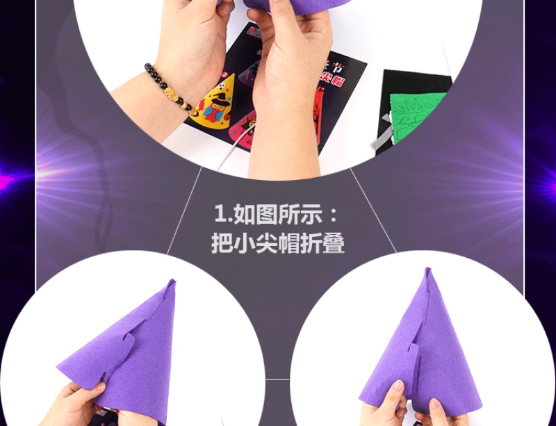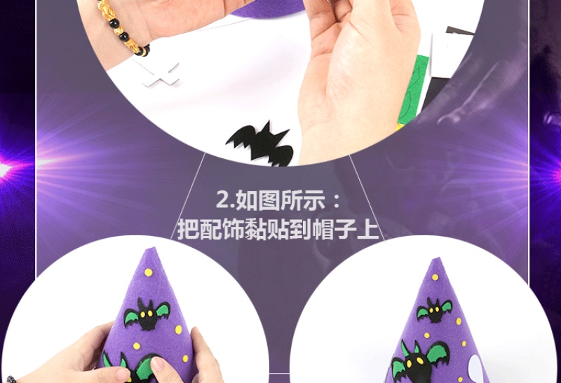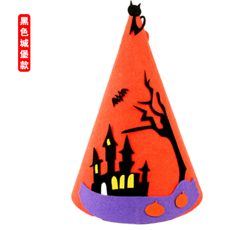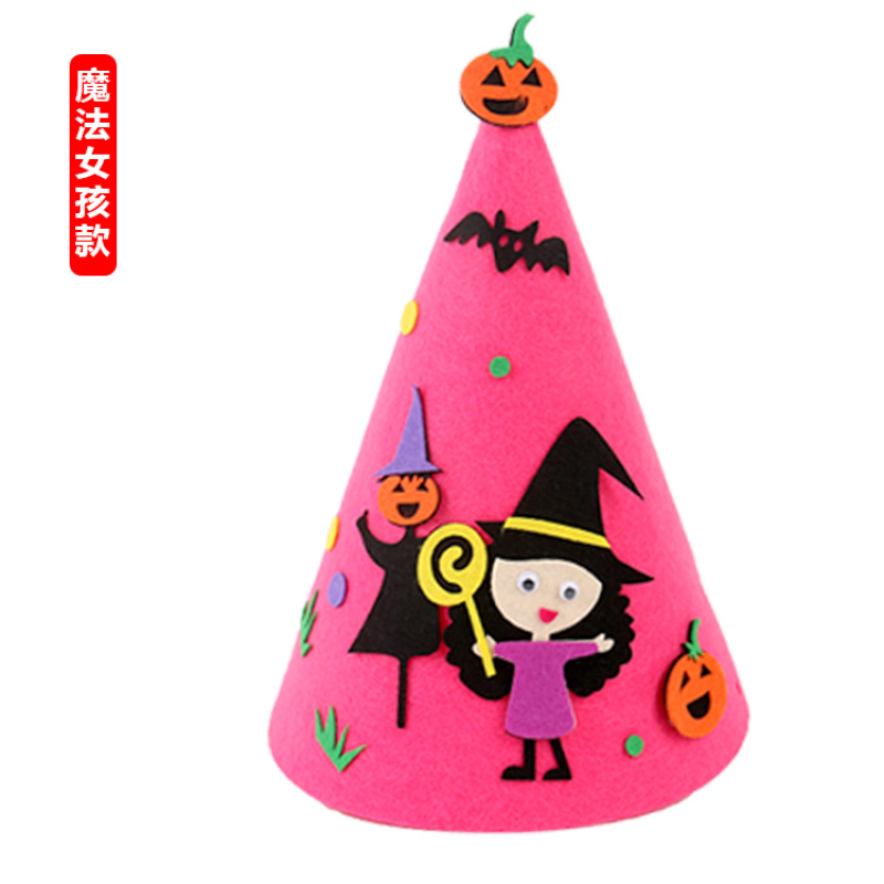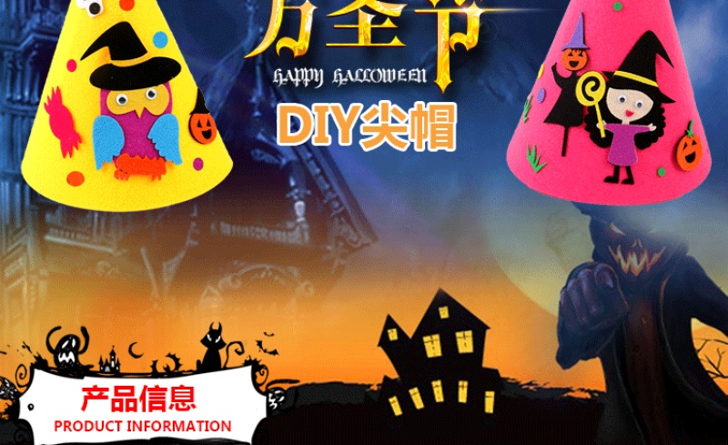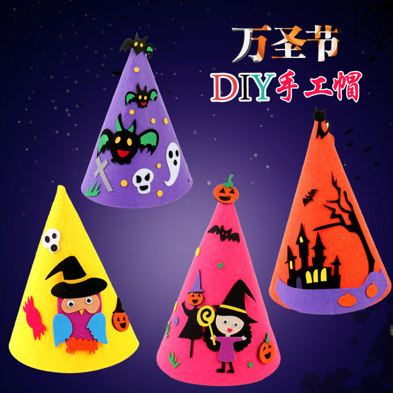 万圣节尖帽 :四个款式? ? 尺寸:高21CM 宽17CM 材质:环保不织布 装箱量400一件 亲收到的是材料包,需要自己动手去做,制作成品更有爱!