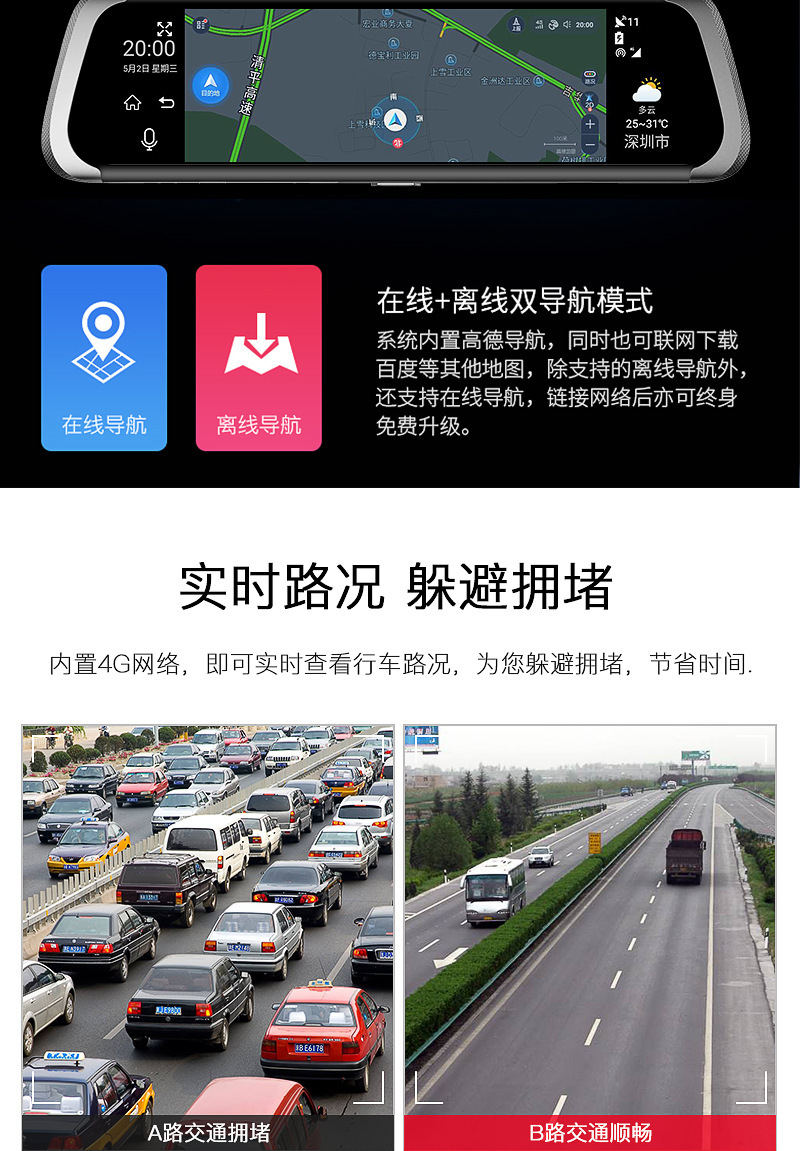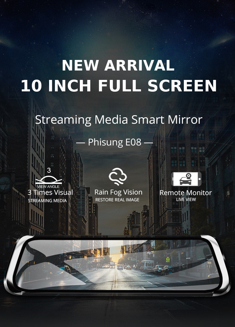 E08跨镜4G流媒体行车记录仪10寸全屏智能后视镜高清安卓电子狗