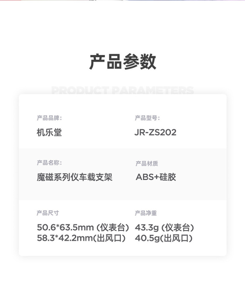 | 型号 | JR-ZS202 | 适用品牌 | 车载 | 适用型号 | 安卓 苹果手机通用 |