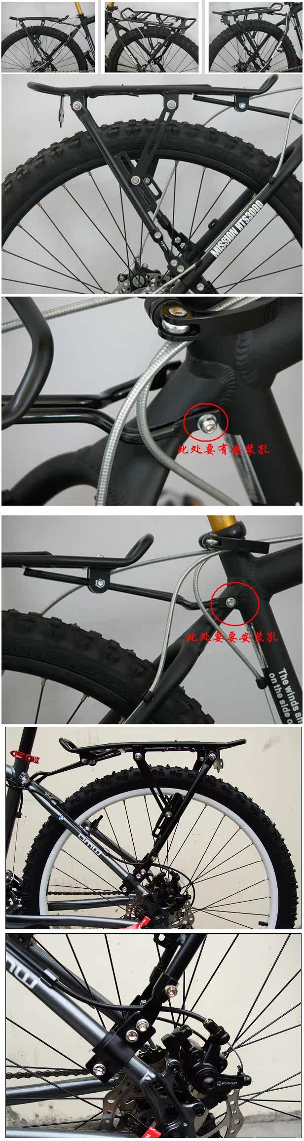 说 明: 这是一款碟刹自行车货架,铝合金,黑色,全套含螺丝重量大约960克。建议承重25KG