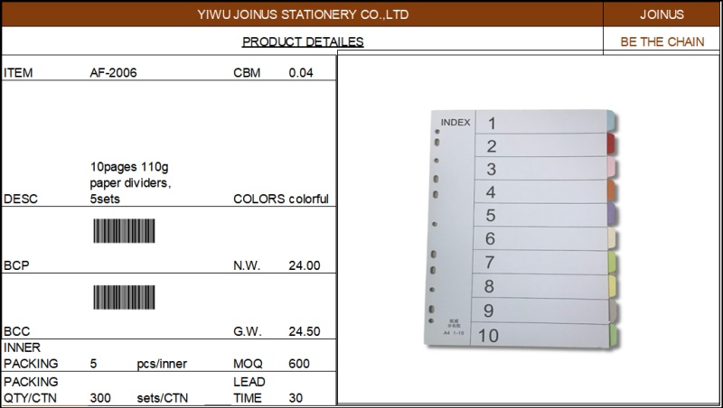 10页纸分类页分隔页110克1本5套 AF-2006
