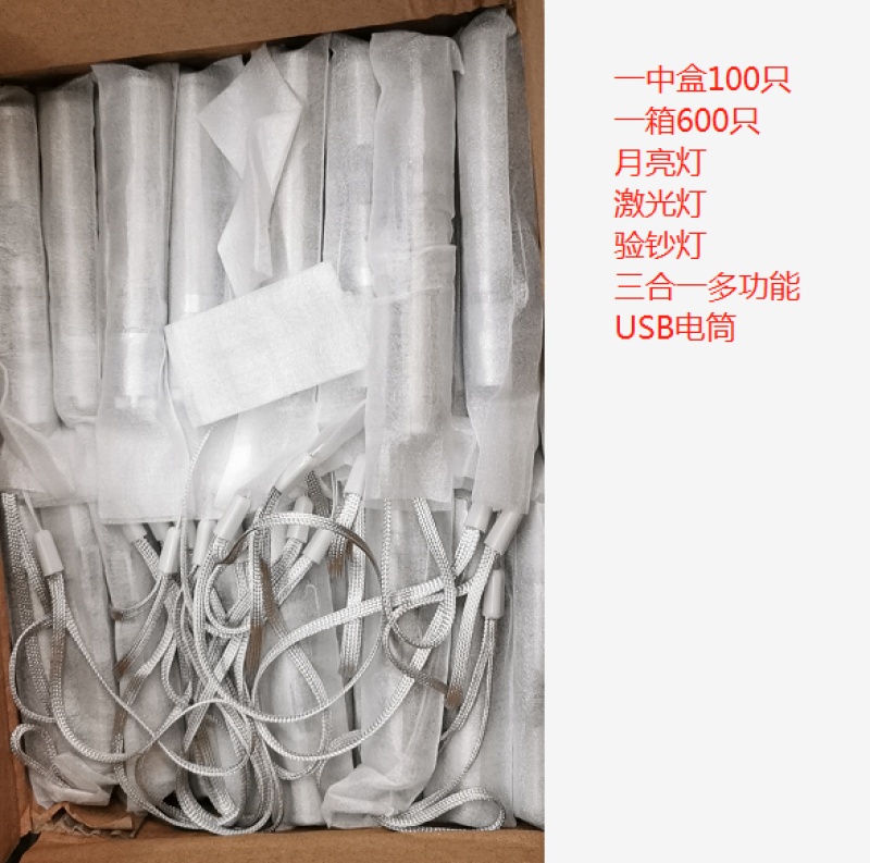 USB直充,有激光射远,紫灯验钞,查看面膜和卫生巾,纸尿裤是否还有荧光粉,给你的健康生活带来便利,白灯射出如同8月15的月亮,所以又称之为月亮灯,一个中盒100只,一箱600只,6个内盒,聚合物电池,320毫安!